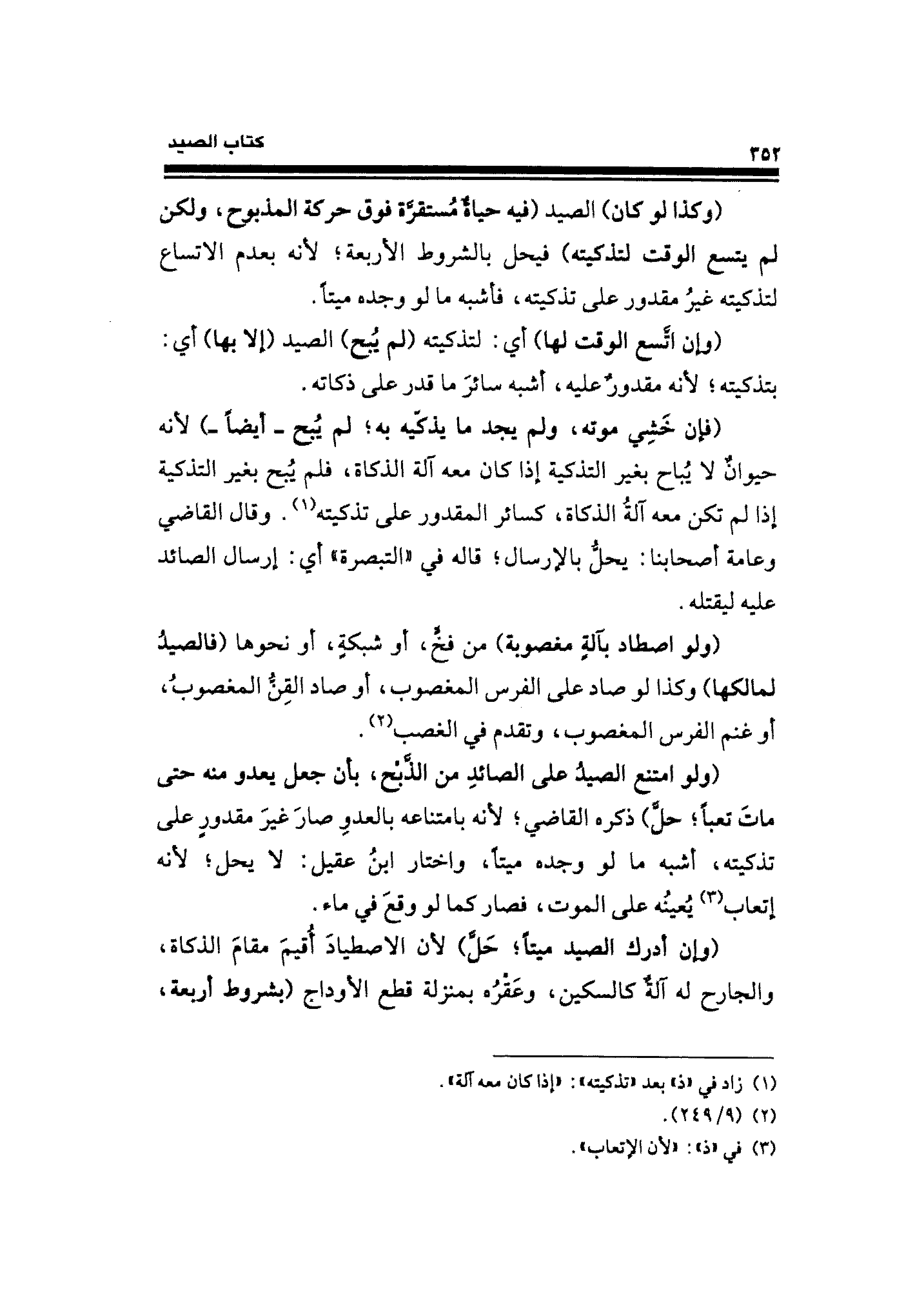(وكذا لو كان) الصيد (فيه حياةٌ مستقرَّة فوق حركة المذبوح، ولكن لم يتسع الوقت لتذكيته) فيحل بالشروط الأربعة، لأنه بعدم الاتساع لتذكيته غيرُ مقدور على تذكيته، فأشبه ما لو وجده ميتًا.