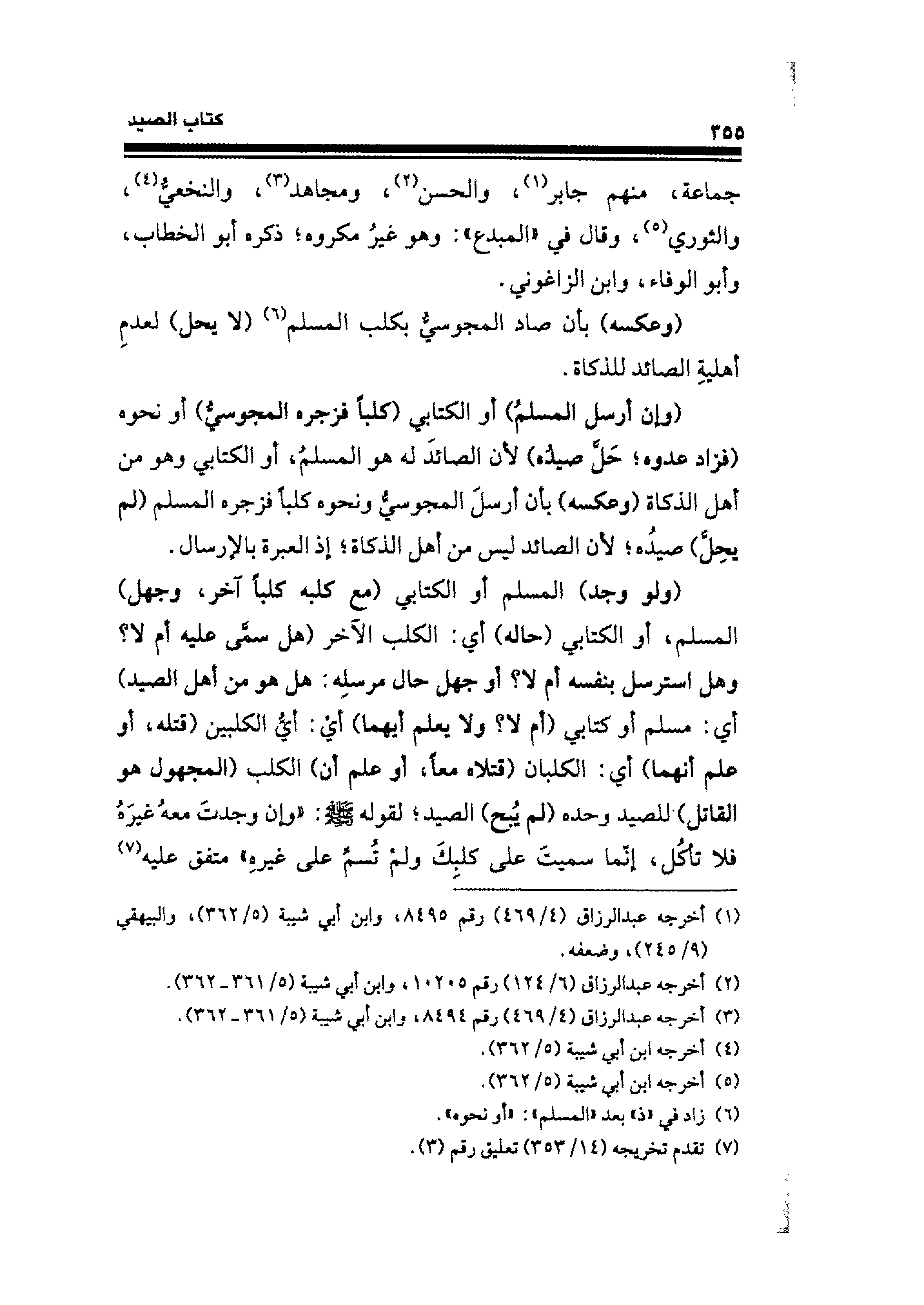 (ولو وجد) المسلم أو الكتابي (مع كلبه كلبًا آخر، وجهل) المسلم، أو الكتابي (حاله) أي: الكلب الآخر (هل سمَّى عليه أم لا؟ وهل استرسل بنفسه أم لا؟ أو جهل حال مرسلِه: هل هو من أهل الصيد) أي: مسلم أو كتابي (أم لا؟ ولا يعلم أيهما) أي: أيُّ الكلبين (قتله، أو علم أنهما) أي: الكلبان (قتلاه معًا، أو علم أن) الكلب (المجهول هو القاتل) للصيد وحده (لم يُبح) الصيد؛ لقرله - صلى الله عليه وسلم -: وإن وجدتَ معهُ غيرَهُ فلا تأكُل، إنما سميتَ على كلبِكَ ولم تُسمِّ على غيره، متفق عليه (¬٧)