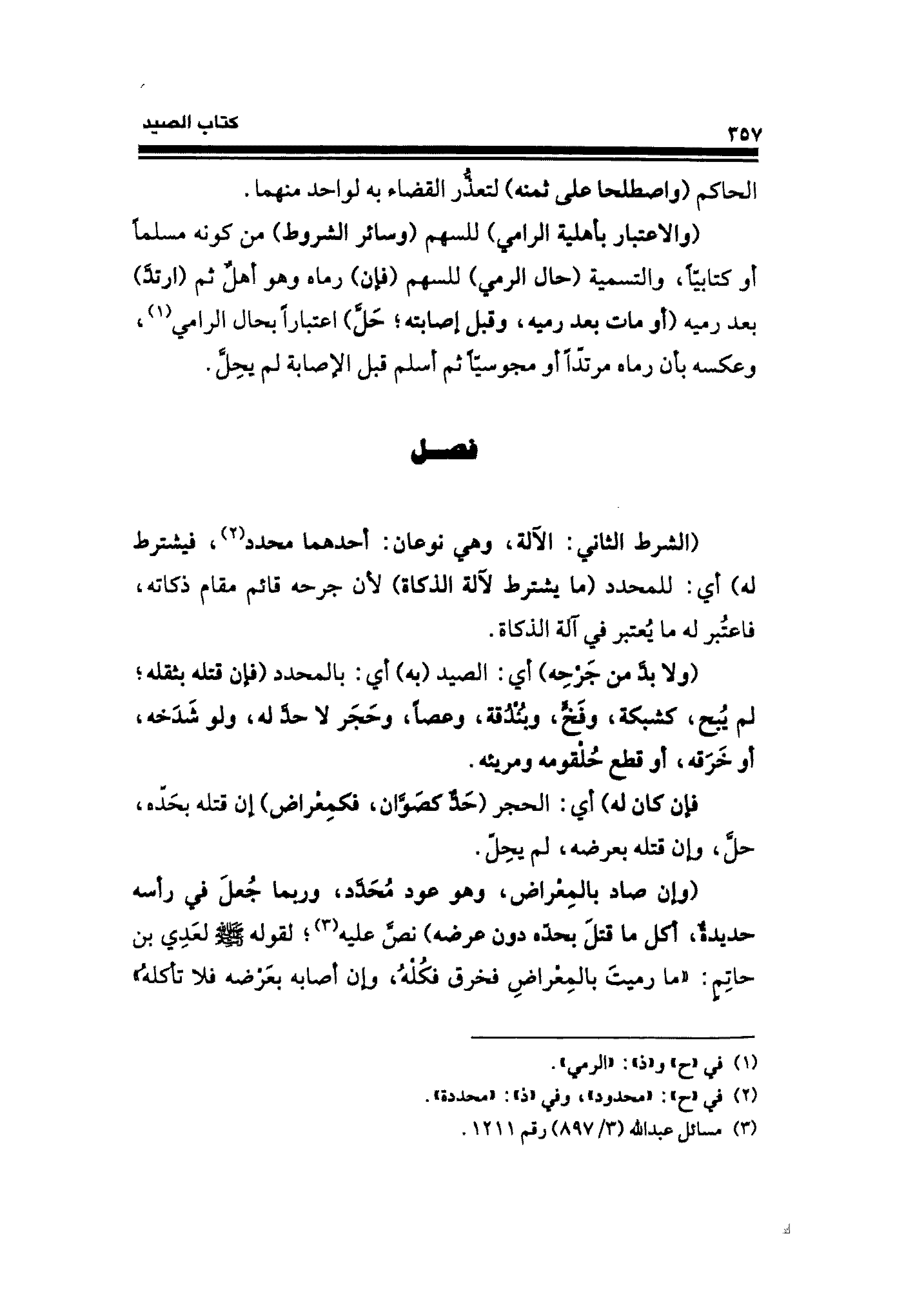 (والاعتبار بأهلية الرامي) للسهم (وسائر الشروط) من كونه مسلمًا أو كتابيًّا، والتسمية (حال الرمي) للسهم (فإن) رماه وهو أهلٌ ثم (ارتدَّ) بعد رميه (أو مات بعد رميه، وقبل إصابته؛ حَلَّ) اعتبارًا بحال الرامي (¬١)، وعكسه بأن رماه مرتدًّا أو مجوسيًّا ثم أسلم قبل الإصابة لم يحِلَّ.