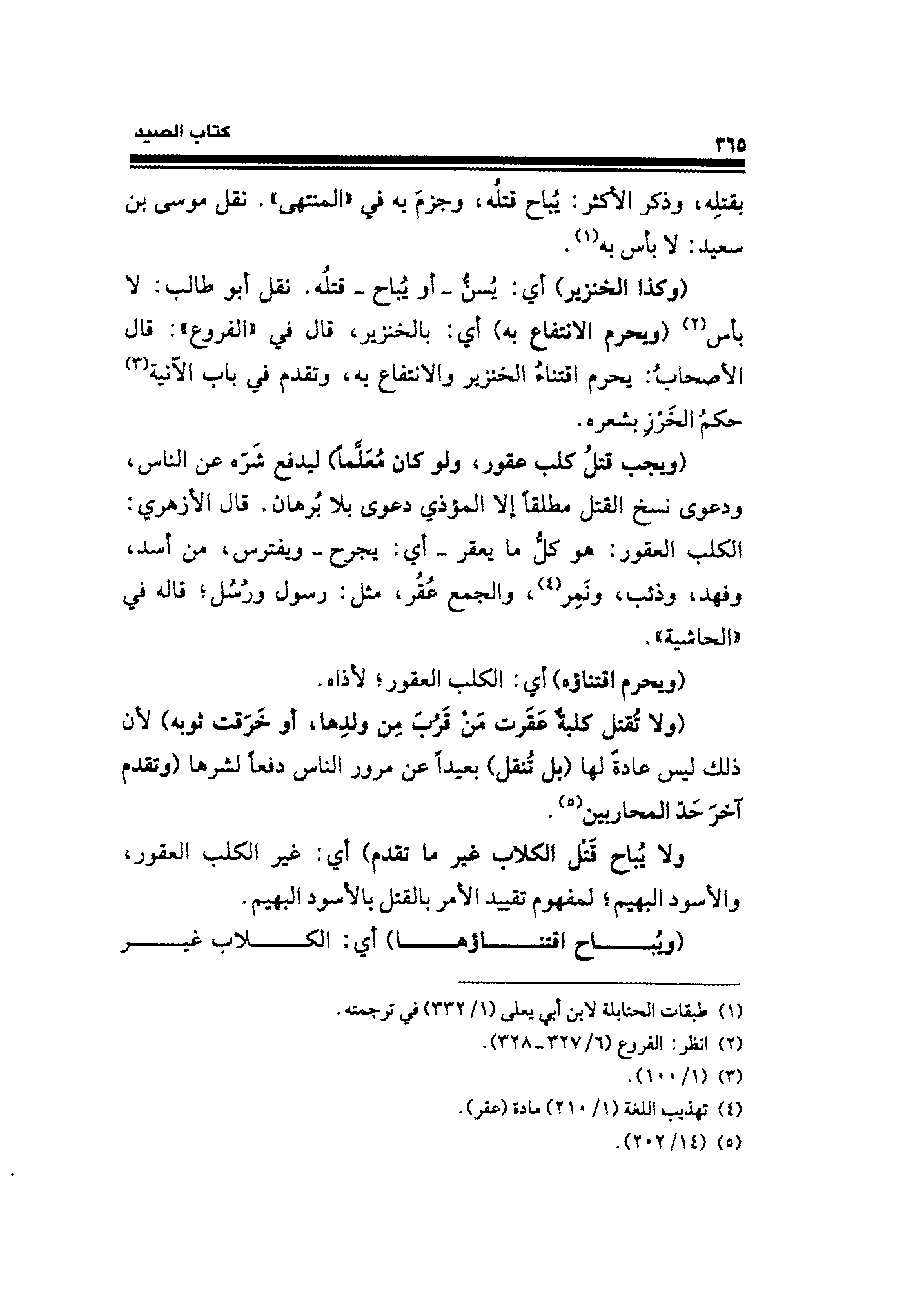 (ويجب قتلُ كلب عقور، ولو كان مُعَلَّمًا) ليدفع شَرّه عن الناس، ودعوى نسخ القتل مطلقًا إلا المؤذي دعوى بلا بُرهان. قال الأزهري: الكلب العقور؛ هو كلُّ ما يعقر -أي: يجرح- ويفترس، من أسد، وفهد، وذئب، ونَمِر (¬٤)، والجمع عُقُر، مثل: رسول ورُسُل؛ قاله في "الحاشية".
