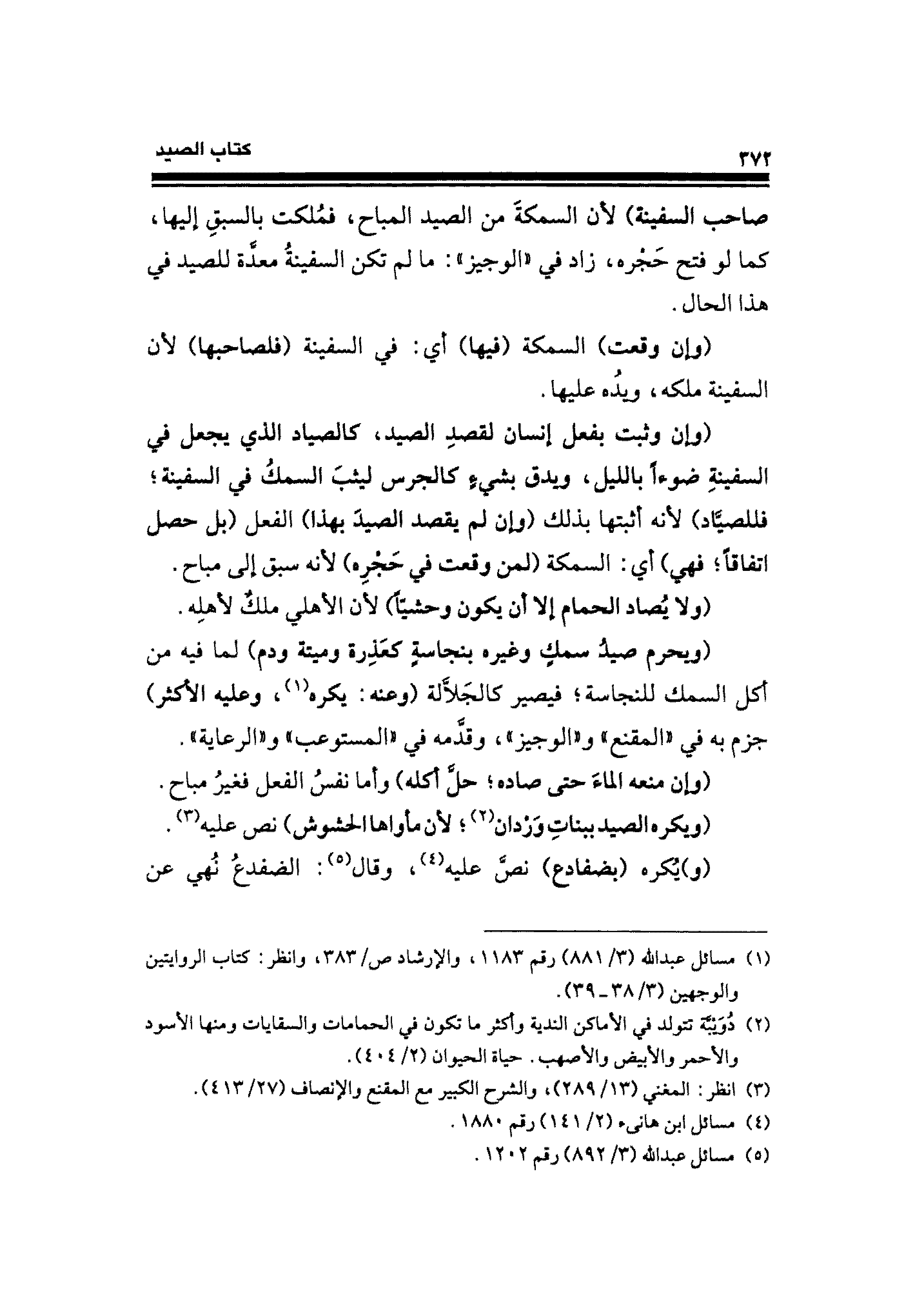 صاحب السفينة) لأن السمكةَ من الصيد المباح، فمُلكت بالسبقِ إليها، كما لو فتح حَجْره، زاد في "الوجيز": ما لم تكن السفينةُ معدَّة للصيد في هذا الحال.