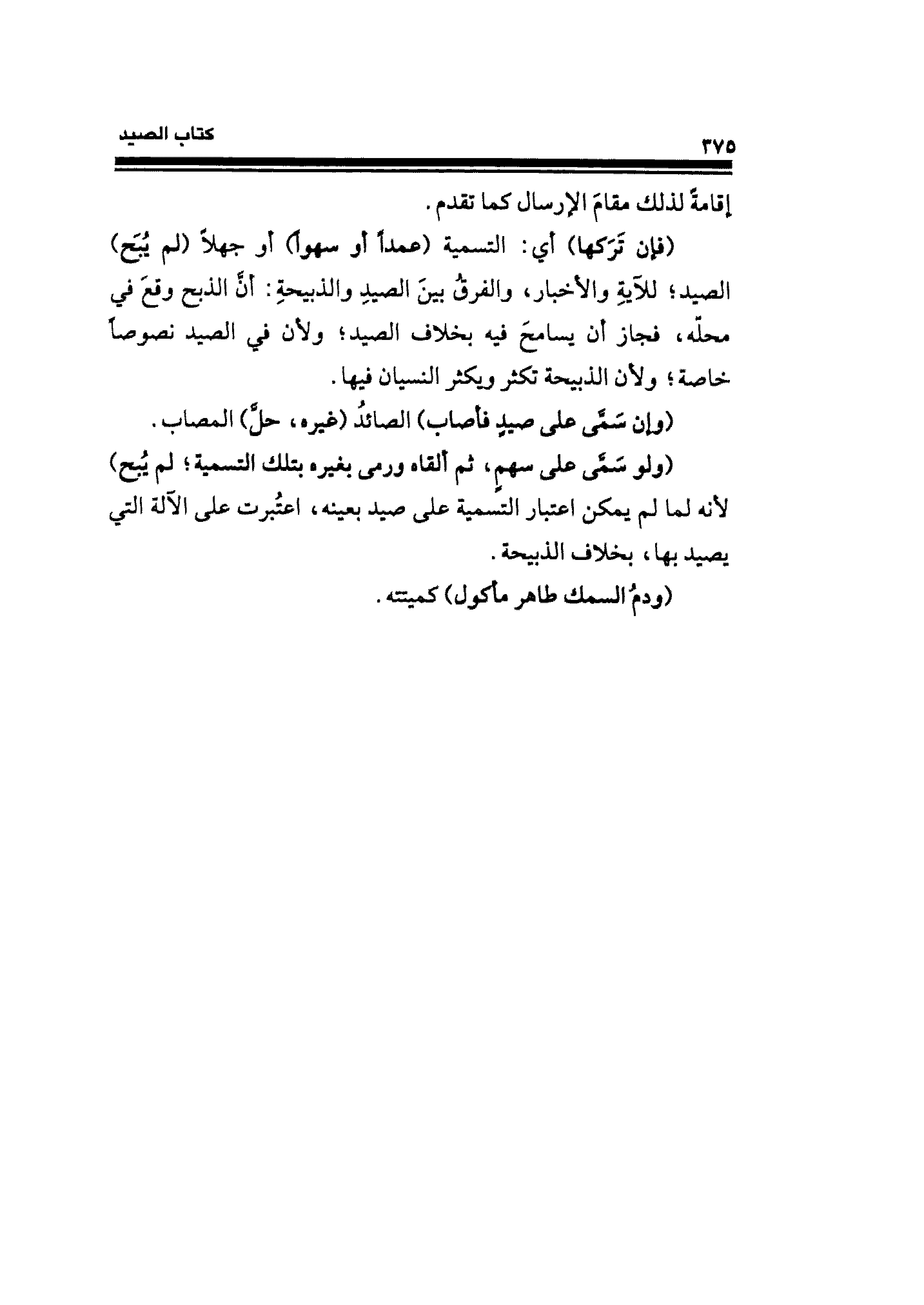 (فإن تَرَكها) أي: التسمية (عمدًا أو سهوًا) أو جهلًا (لم يُبَح) الصيد؛ للآية والأخبار، والفرقُ بينَ الصيدِ والذبيحةِ: أنَّ الذبح وقعَ في محلّه، فجاز أن يسامحَ فيه بخلاف الصيد؛ ولأن في الصيد نصوصًا خاصة؛ ولأن الذبيحة تكثر ويكثر النسيان فيها.
