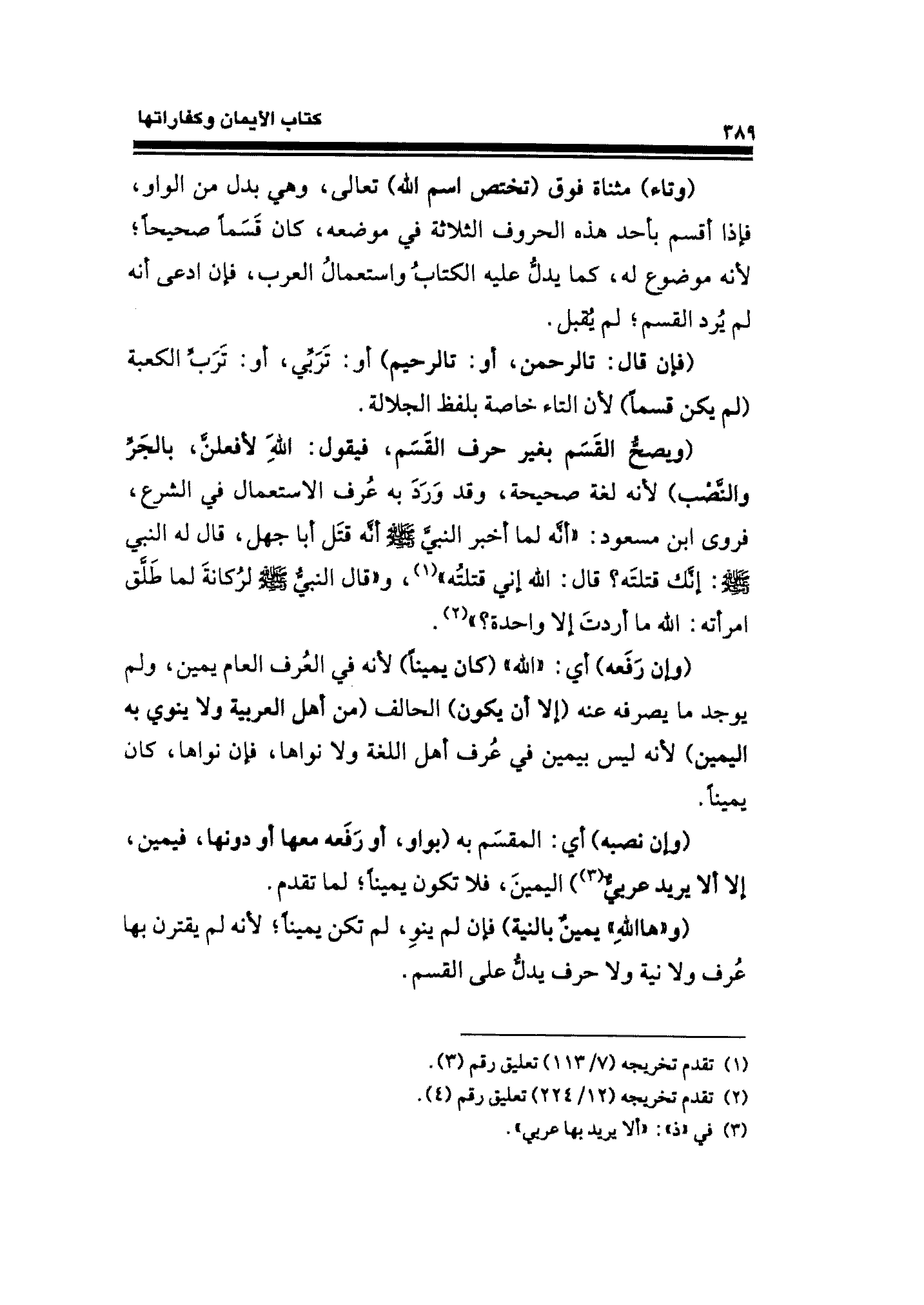 (وتاء) مثناة فوق (تختص اسم الله) تعالى، وهي بدل من الواو، فإذا أقسم بأحد هذه الحروف الثلاثة في موضعه، كان قَسَمًا صحيحًا؛ لأنه موضوع له، كما يدلُّ عليه الكتابُ واستعمالُ العرب، فإن ادعى أنه لم يُرد القسم؛ لم يُقبل.