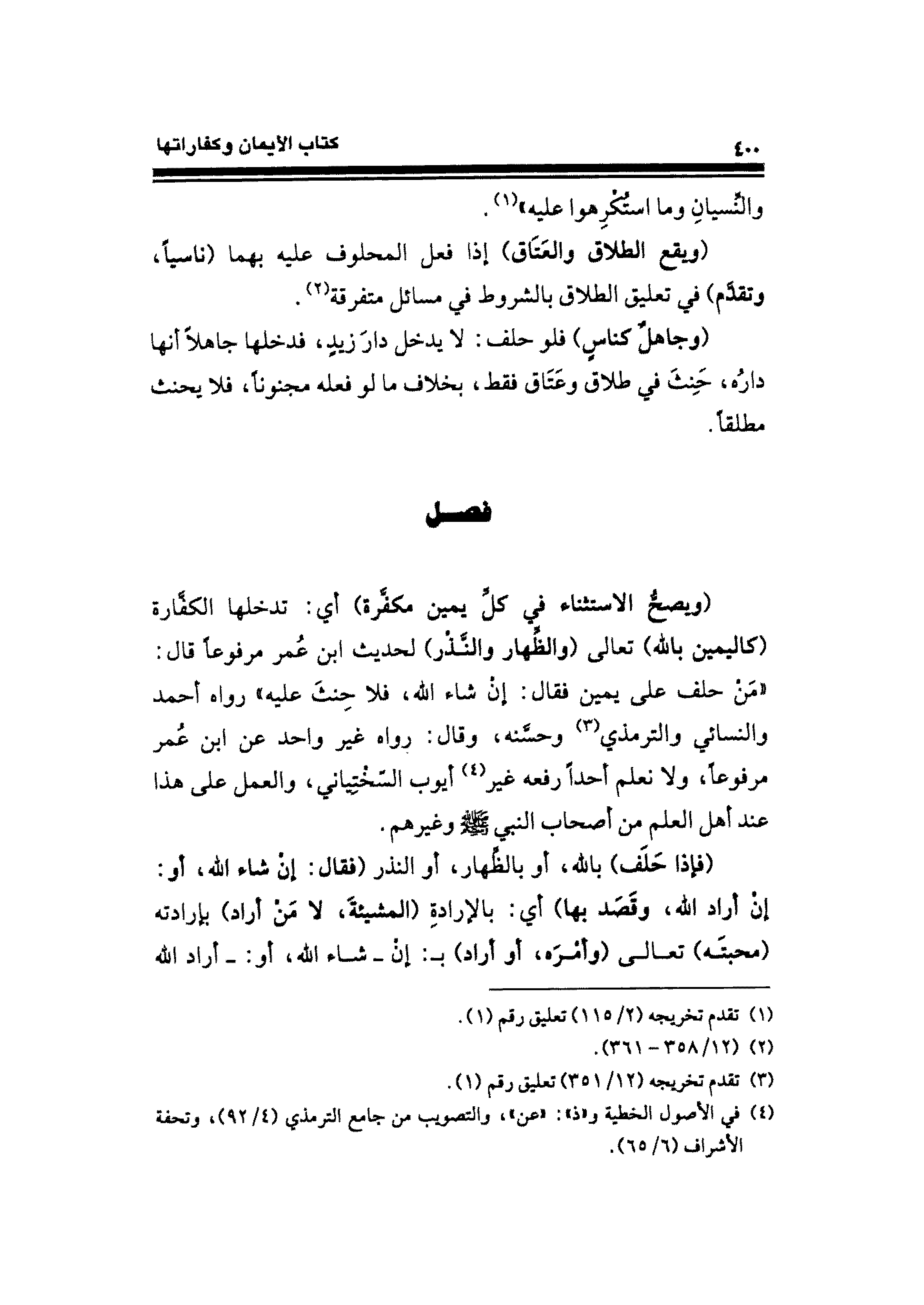 (ويصحُّ الاستثناء في كل يمين مكفرة) أي: تدخها الكفارة (كاليمين بالله) تعالى (والظهار والنذر) لحديث ابن عمر مرفوعًا قال: "مَن حلف على يمين فقال: إن شاء الله، فلا حِنثَ عليه، رواه أحمد والنسائي والترمذي (¬٣) وحسنه، وقال: رواه غير واحد عن ابن عُمر مرفوعًا، ولا نعلم أحدًا رفعه غير (¬٤) أيوب السختياني، والعمل على هذا عند أهل العلم من أصحاب النبي - صلى الله عليه وسلم - وغيرهم.