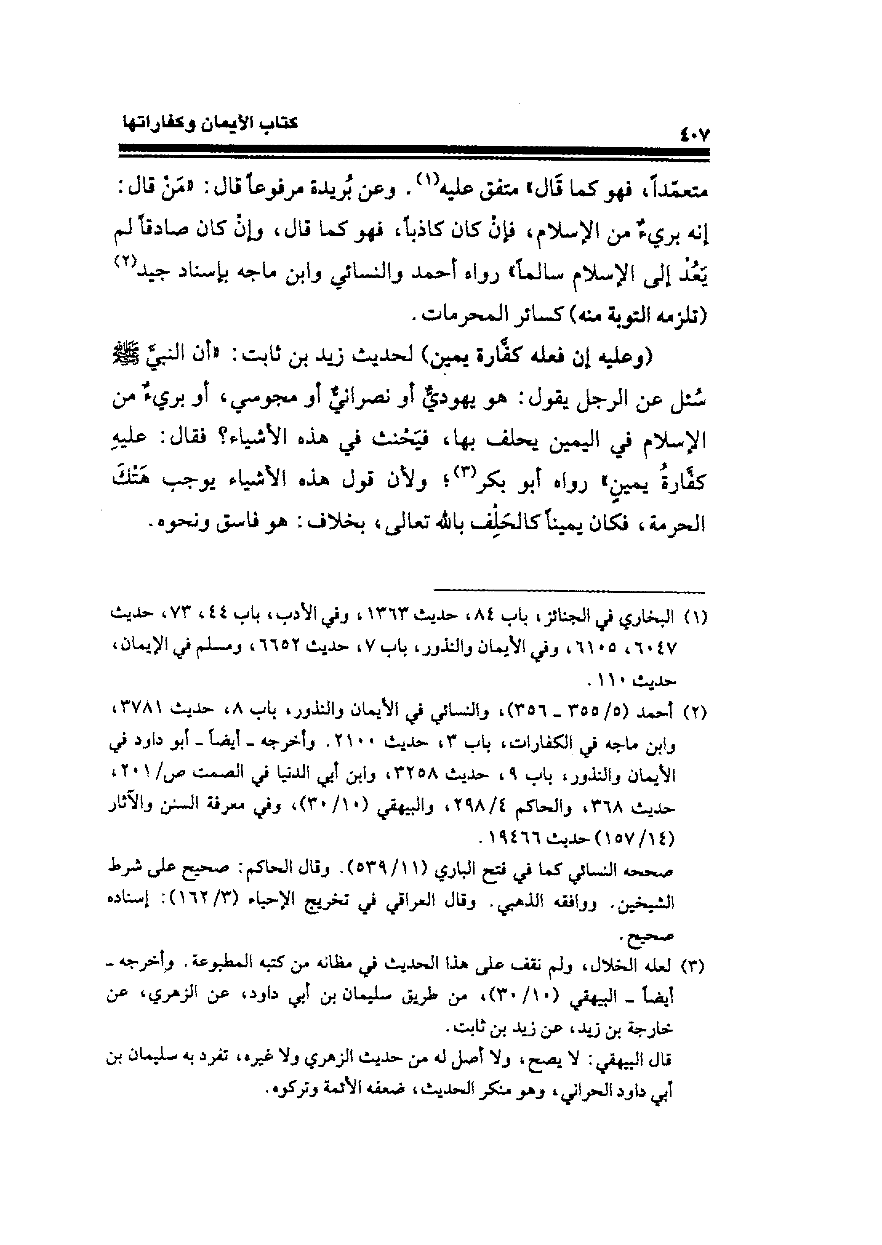 (وعليه أن فعله كفارة يمين) لحديث زيد بن ثابت: "أن النبي - صلى الله عليه وسلم - سُئل عن الرجل يقول: هو يهودي أو نصراني أو مجوسي، أو بريءٌ من الإِسلام في اليمين يحلف بها، فيَحنث في هذه الأشياء؟ فقال: عليهِ كفارةُ يمينٍ" رواه أبو بكر (¬٣)؛ ولأن قول هذه الأشياء يوجب هَتكَ الحرمة، فكان يمينًا كالحَلف بالله تعالى، بخلاف: هو فاسق ونحوه.