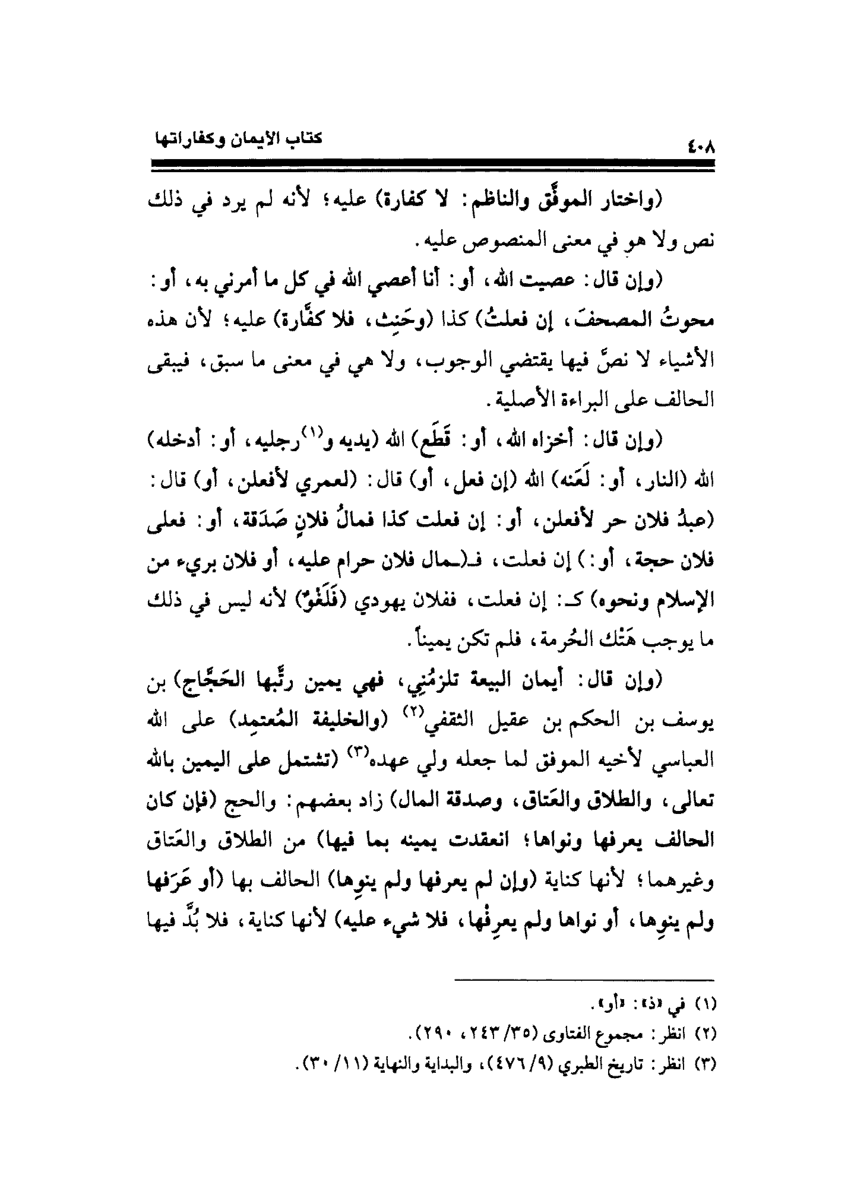 (وإن قال: أيمان البيعة تلزمُنِي، فهي بين رتَّبها الحَجَّاج) بن يوسف بن الحكم بن عقيل الثقفي (¬٢) (والخليفة المُعتمِد) على الله العباسي لأخيه الموفق لما جعله ولي عهده (¬٣) (تشتمل على اليمين بالله تعالى، والطلاق والعَتاق، وصدق المال) زاد بعضهم: والحج (فإن كان الحالف يعرفها ونواها؛ انعقدت يمينه بما فيها) من الطلاق والعَتاق وغيرهما؛ لأنها كناية (وإن لم يعرفها ولم ينوها) الحالف بها (أو عَرَفها ولم ينوِها، أو نواها ولم يعرِفْها، فلا شيء عليه) لأنها كناية، فلا بُدَّ فيها