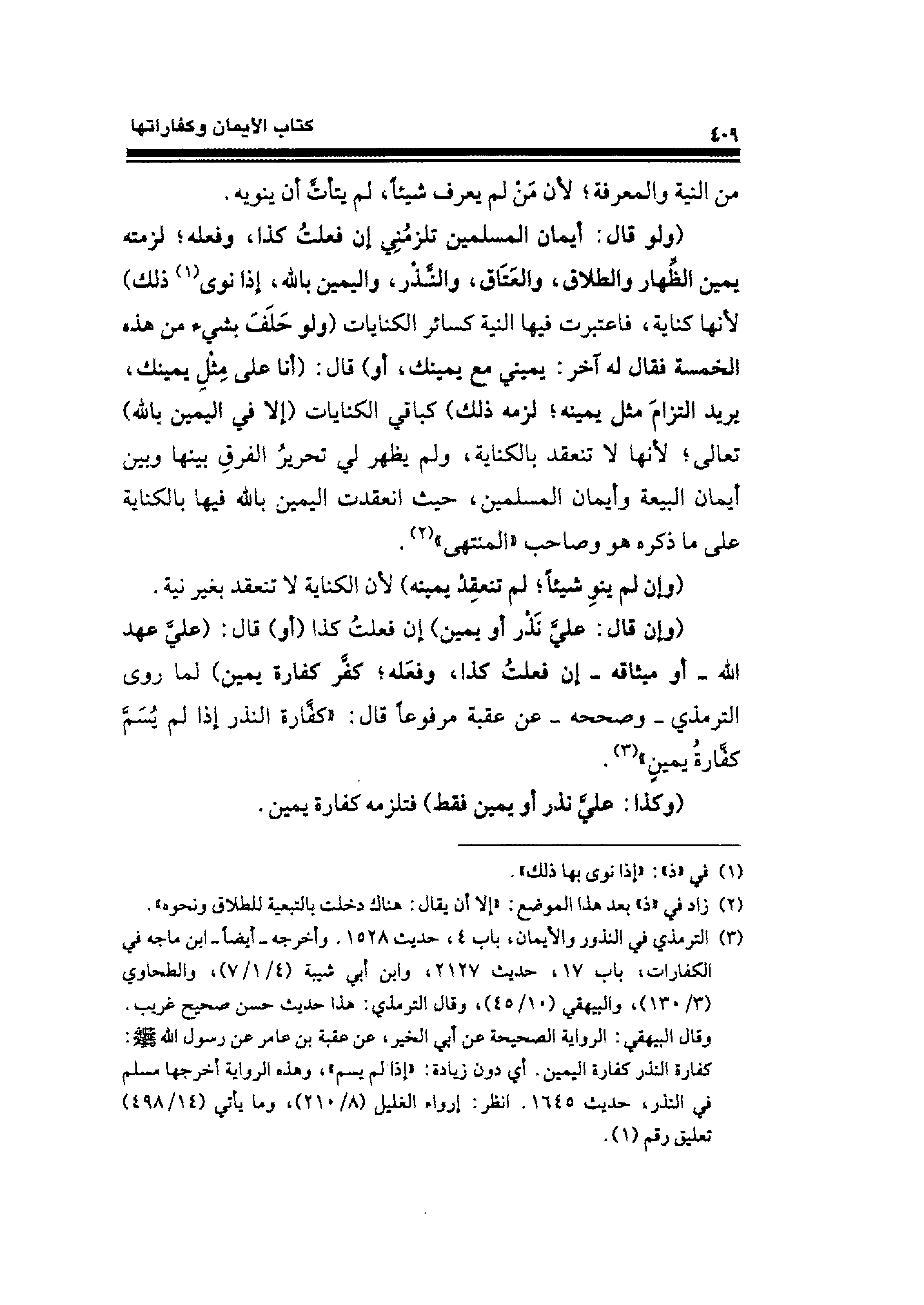 (¬٣) الترمذي في النذور والأيمان، باب ٤، حديث ١٥٢٨. وأخرجه -أيضًا- ابن ماجه في الكفارات، باب ١٧، حديث ٢١٢٧، وابن أبي شيبة (٤/ ١ / ٧)، والطحاوي (٣/ ١٣٠)، والبيهقي (٤٥/ ١٠)، وقال الترمذي: هذا حديث حسن صحيح غريب. وقال البيهقي: الرواية الصحيحة عن أبي الخير، عن عقبة بن عامر عن رسول الله - صلى الله عليه وسلم -: كفارة النذر كفارة اليمين. أي دون زيادة: "إذا لم يسم" وهذه الرواية أخرجها مسلم في النذر، حديث ١٦٤٥. انظر: إرواء الغليل (٢١٠/ ٨)، وما يأتي (١٤/ ٤٩٨) تعليق رقم (١).