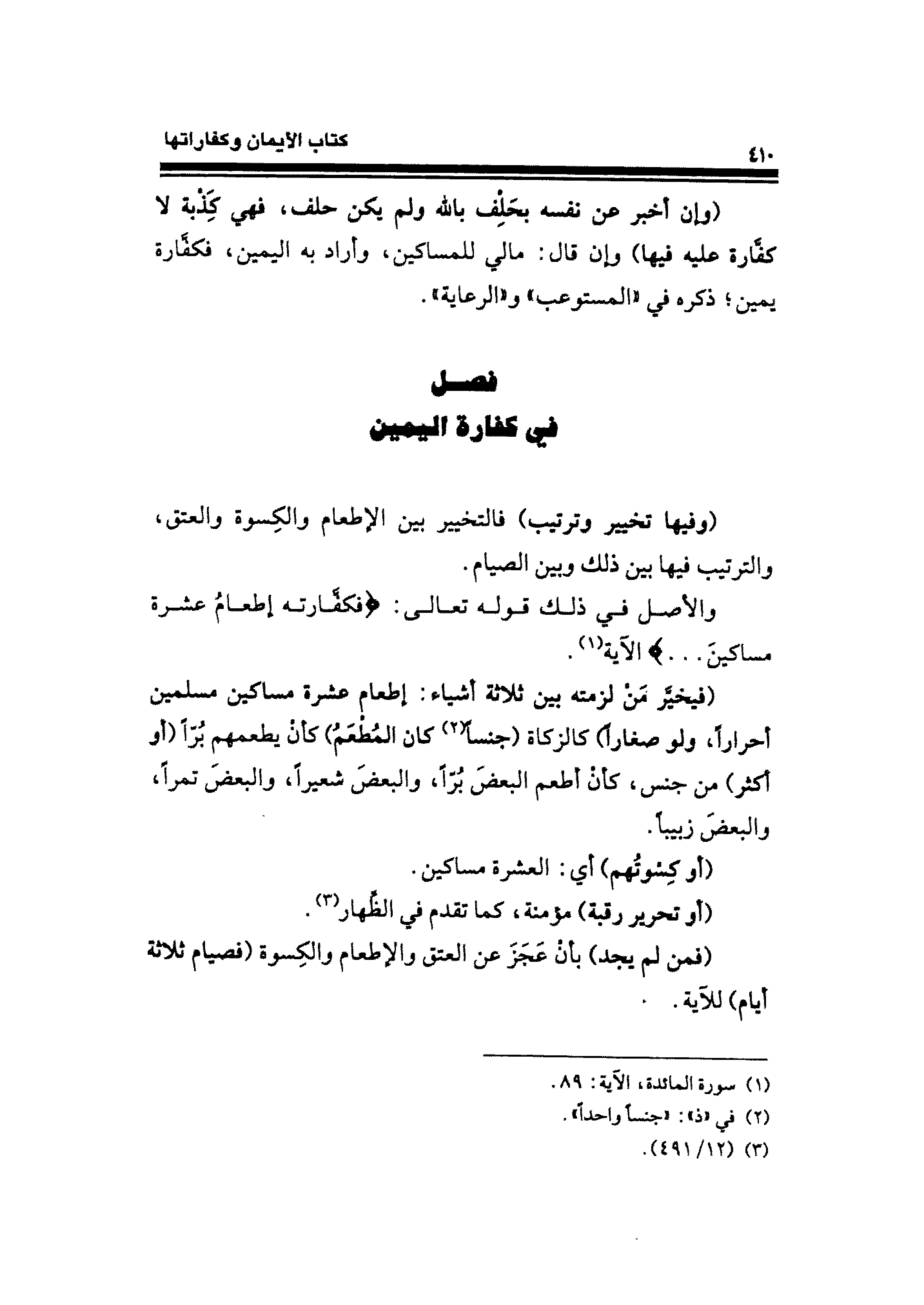 (وفيها تخيير وترتيب) فالتخيير بين الإطعام والكِسوة والعتق، والترتيب فيها بين ذلك وبين الصيام.