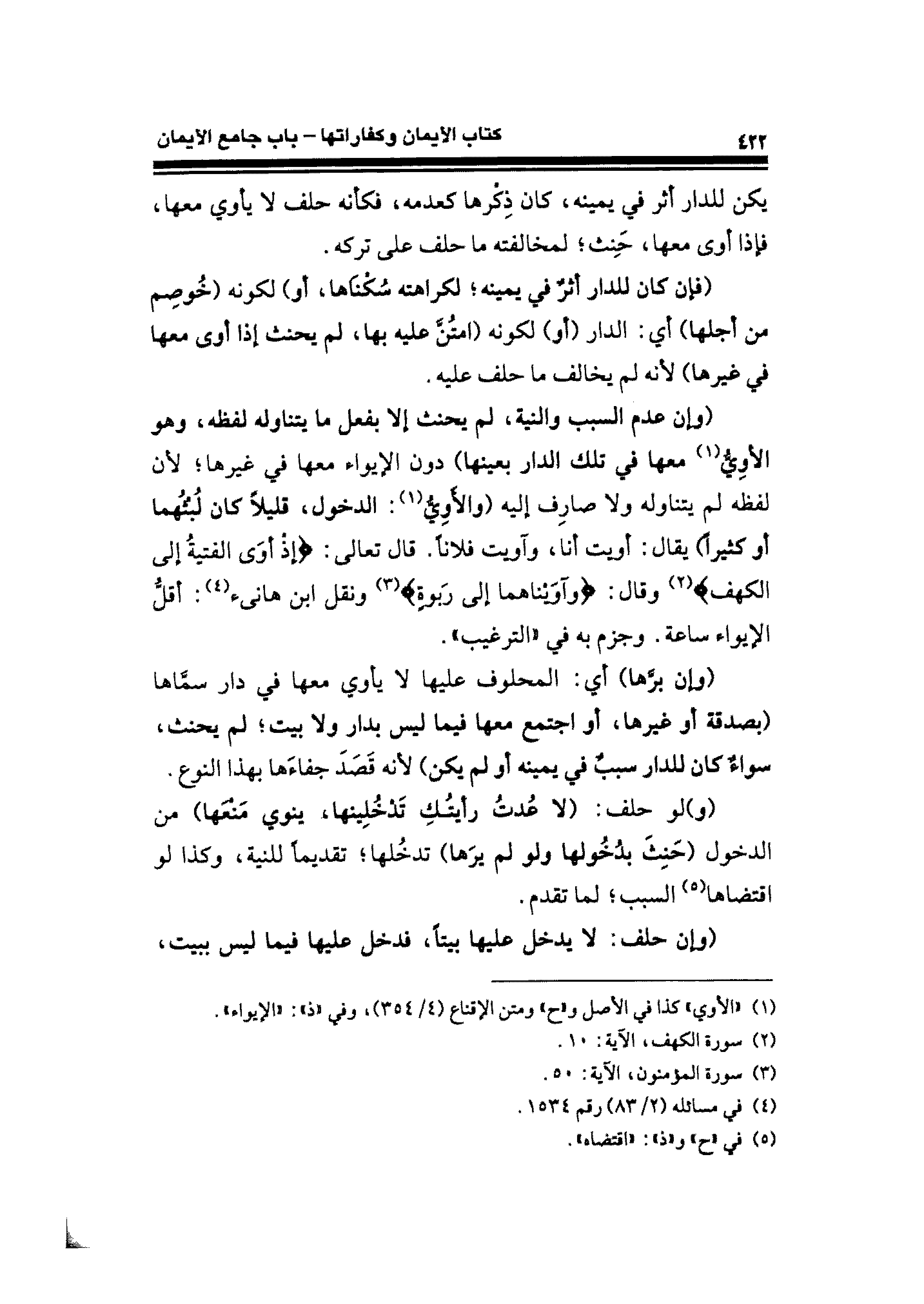 (وإن عدم السبب والنية، لم يحنث إلا بفعل ما يتناوله لفظه، وهو الأويُّ (¬١) معها في تلك الدار بعينها) دون الإيواء معها في غيرها؛ لأن لفظه لم يتناوله ولا صارِف إليه (والأَويُّ (¬١): الدخول، قليلًا كان لُبْثُهما أو كثيرًا) يقال: أويت أنا، وآويت فلانًا. قال تعالى: {إذ أوَى الفتيةُ إلى الكهف} (¬٢) وقال: {وآوَيناهما إلى رَبوةٍ} (¬٣) ونقل ابن هانئ (¬٤): أقلُّ الإيواء ساعة. وجزم به في "الترغيب".