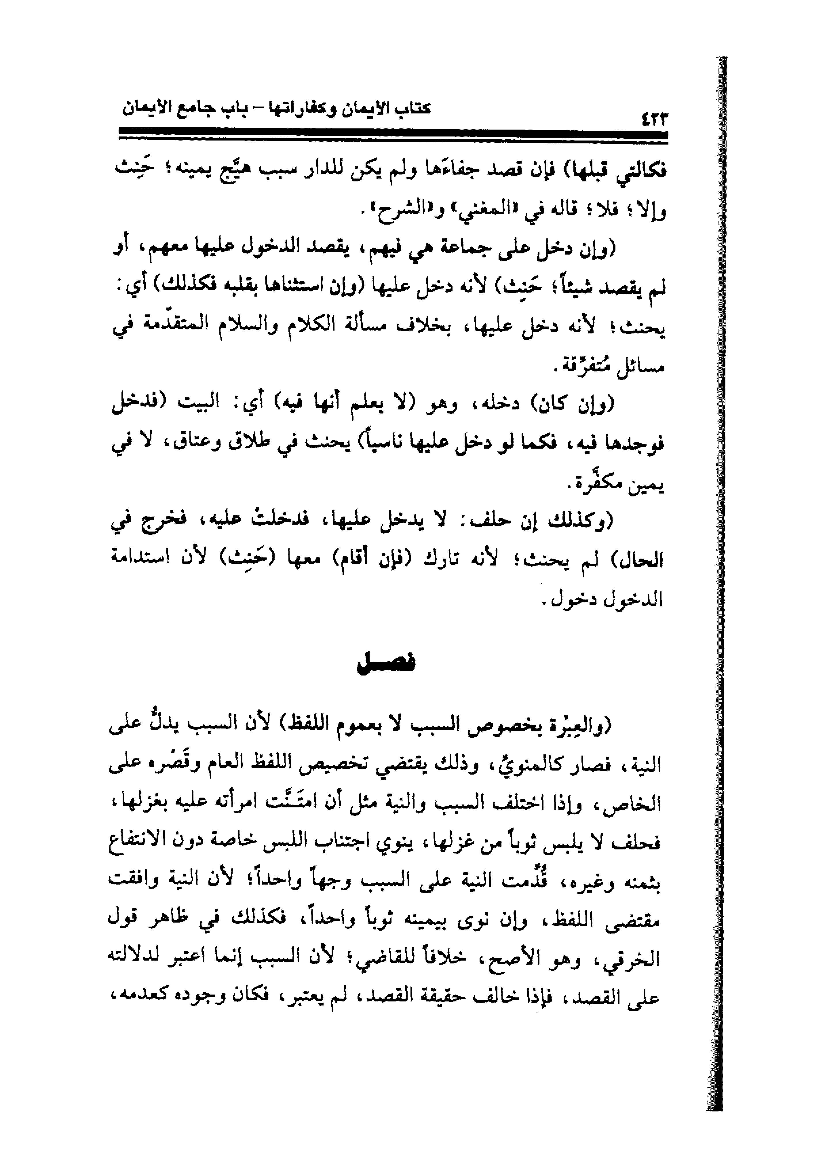 (والعِبْرة بخصوص السبب لا بعموم اللفظ) لأن السبب يدلُّ على النية، فصار كالمنويِّ، وذلك يقتضي تخصيص اللفظ العام وقَصْره على الخاص، وإذا اختلف السبب والنية مثل أن امتَنَّت امرأته عليه بغزلها، فحلف لا يلبس ثوبًا من غزلها، ينوي اجتناب اللبس خاصة دون الانتفاع بثمنه وغيره، قُدِّمت النية على السبب وجهًا واحدًا؛ لأن النية وافقت مقتضى اللفظ، وإن نوى بيمينه ثوبًا واحدًا، فكذلك في ظاهر قول الخرقي، وهو الأصح، خلافًا للقاضي؛ لأن السبب إنما اعتبر لدلالته على القصد، فإذا خالف حقيقة القصد، لم يعتبر، فكان وجوده كعدمه،