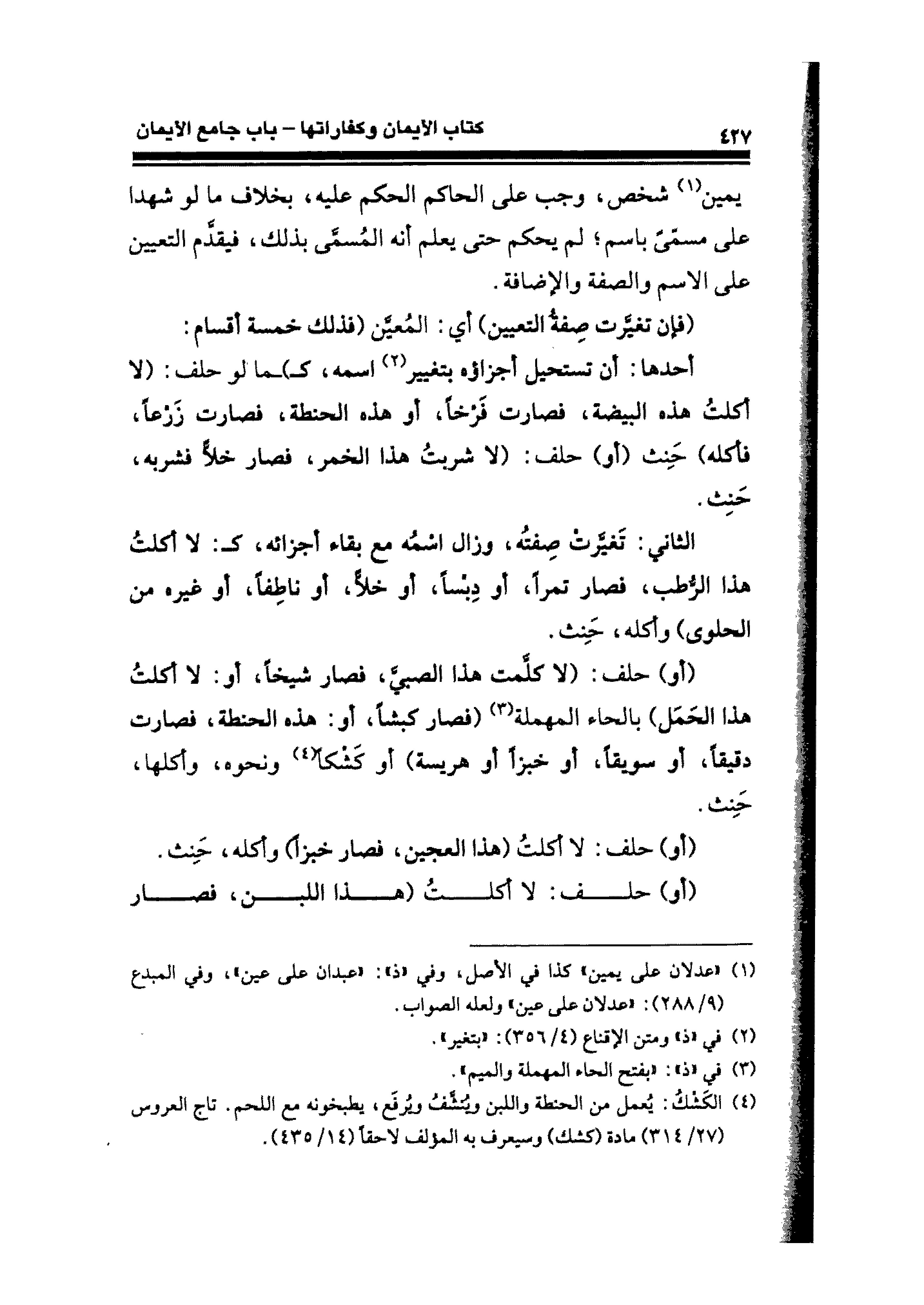 (أو) حلف: (لا كلَّمت هذا الصبيَّ، فصار شيخًا، أو: لا أكلتُ هذا الحَمَل) بالحاء المهملة (¬٣) (فصار كبشًا، أو: هذه الحنطة، فصارت دقيقًا، أو سويقًا، أو خبزًا أو هريسة) أو كَشْكًا (¬٤) ونحوه، وأكلها، حَنِث.