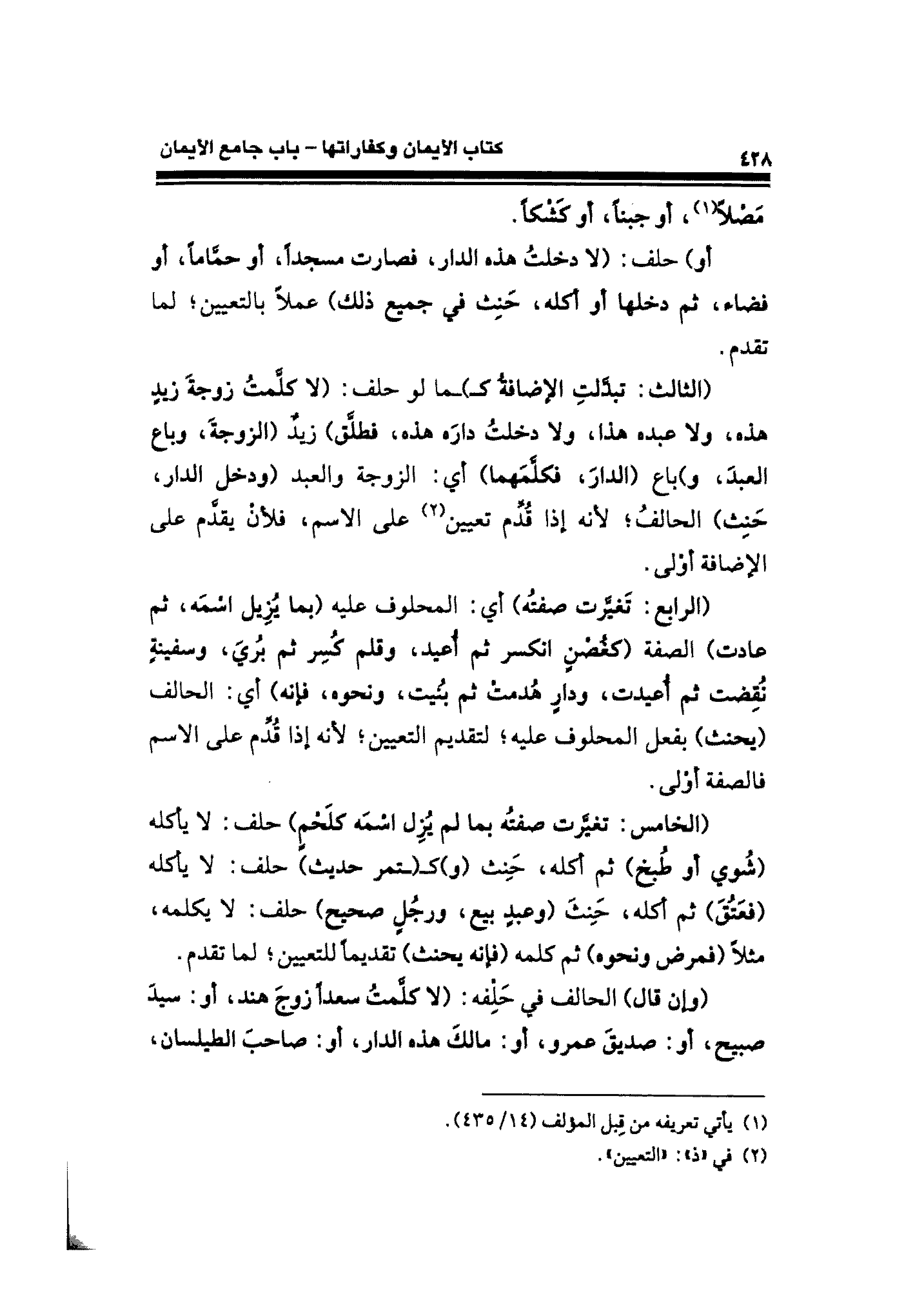 (الثالث: تبدَّلتِ الإضافةُ كـ) ـما لو حلف: (لا كلَّمتُ زوجةَ زيدٍ هذه، ولا عبده هذا، ولا دخلتُ دارَه هذه، فطلَّق) زيدٌ (الزوجةَ، وباع العبدَ، و) باع (الدارَ، فكلَّمَهما) أي: الزوجة والعبد (ودخل الدار، حَنِث) الحالفُ؛ لأنه إذا قُدِّم تعيين (¬٢) على الاسم، فلأن يقدَّم على الإضافة أوْلى.