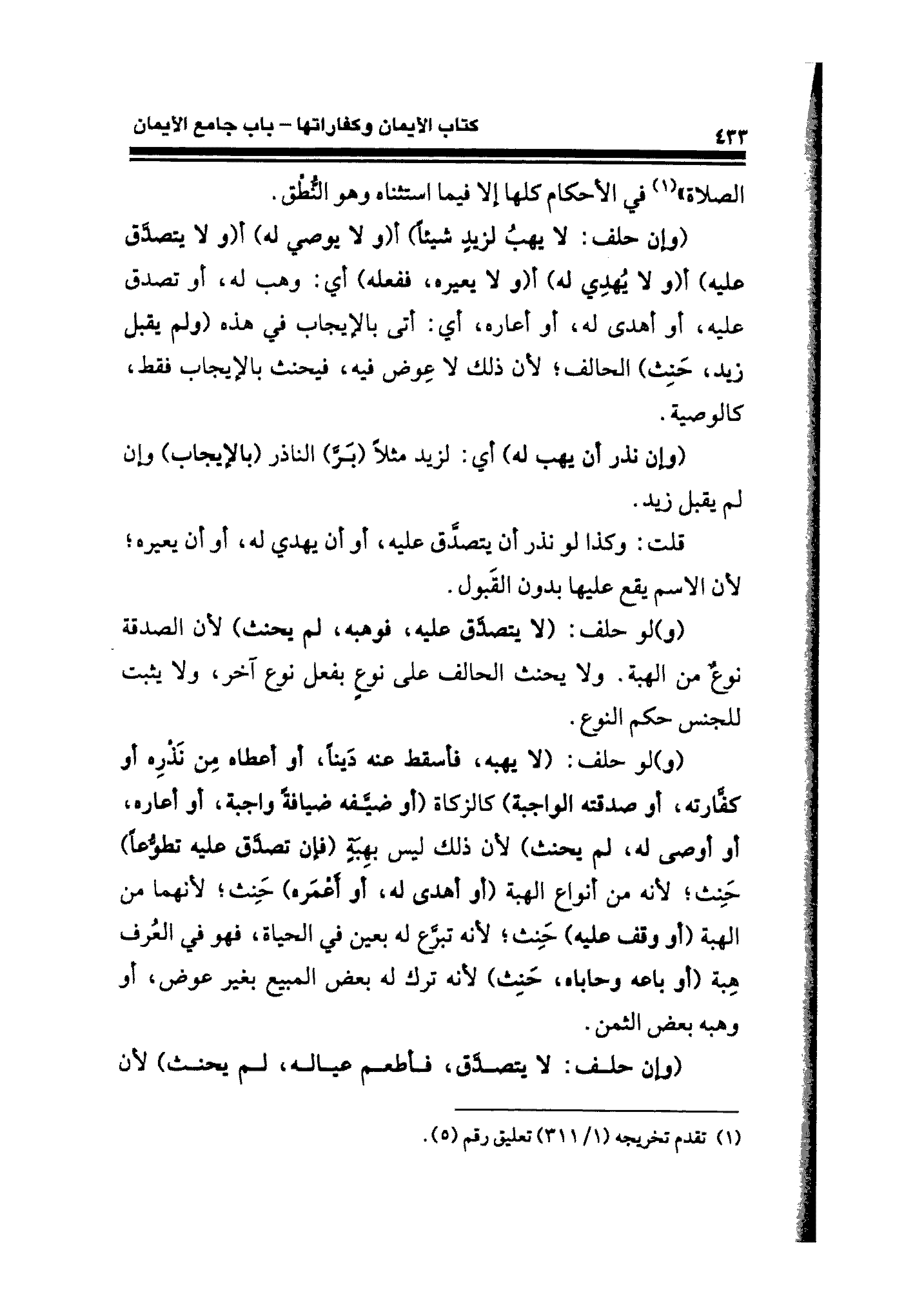 (وإن حلف: لا يهبُ لزيدٍ شيئًا) أ (و لا يوصي له) أ (و لا يتصدق عليه) أ (و لا يُهدِي له) أ (و لا يعيره، ففعله) أي: وهب له، أو تصدق عليه، أو أهدى له، أو أعاره، أي: أتى بالإيجاب في هذه (ولم يقبل زيد، حَنِث) الحالف؛ لأن ذلك لا عِوض فيه، فيحنث بالإيجاب فقط، كالوصية.