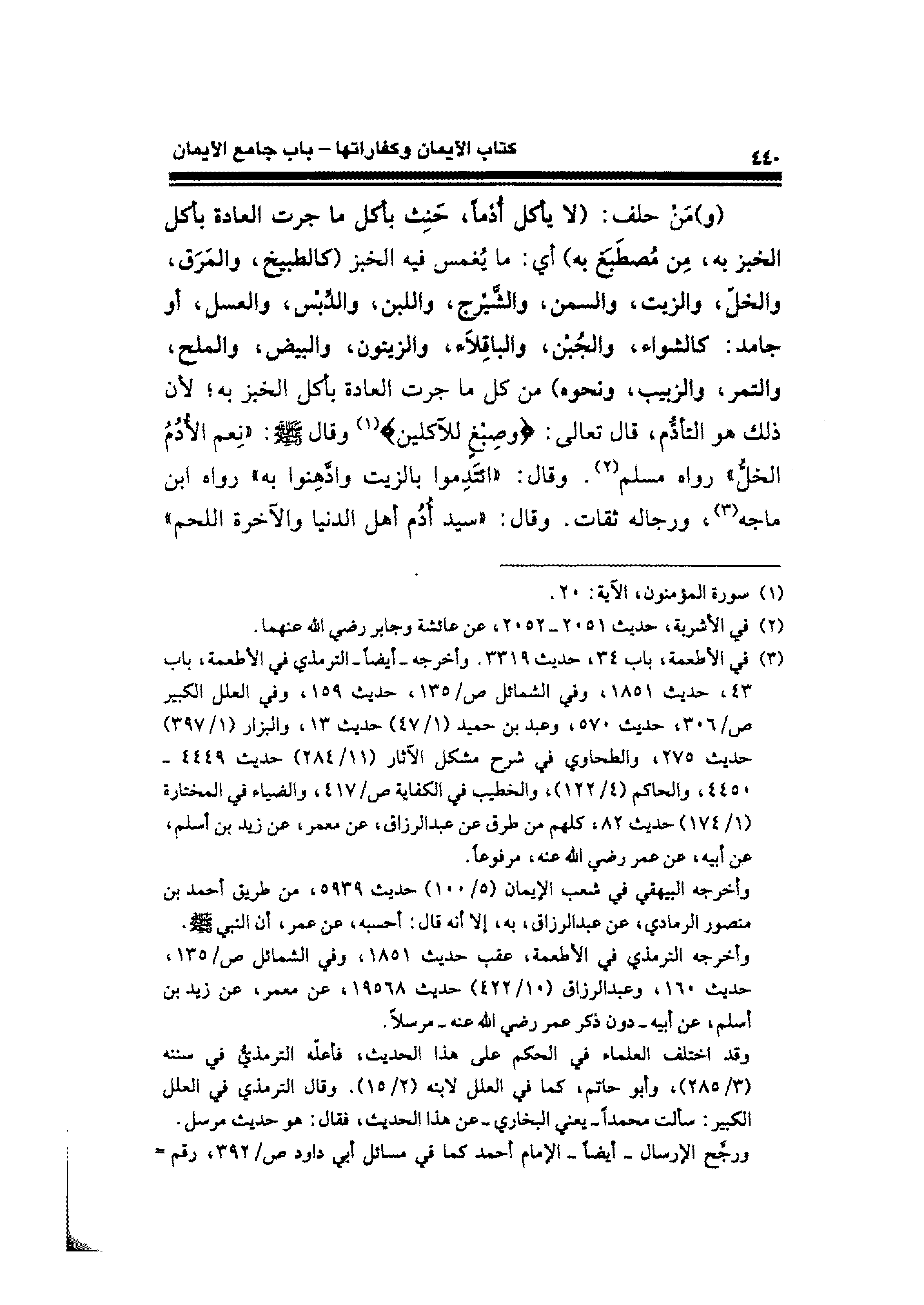 (و) مَنْ حلف: (لا يأكل أُدْمًا، حَنِث بأكل ما جرت العادة بأكل الخبز به، مِن مُصطَبغ به) أي: ما يُغمس فيه الخبز (كالطبيخ، والمَرَق، والخلّ، والزيت، والسمن، والشَّيْرج، واللبن، والدِّبس، والعسل، أو جامد: كالشواء، والجُبْن، والباقِلاء، والزيتون، والبيض، والملح، والتَّمر، والزبيب، ونحوه) من كل ما جرت العادة بأكل الخبز به؛ لأن ذلك هو التأدُّم، قال تعالى: {وَصِبْغٍ لِلْآكِلِينَ} (¬١) وقال - صلى الله عليه وسلم -: "نِعم الأُدُمُ الخلُّ" رواه مسلم (¬٢). وقال: "ائتَدِموا بالزيت وادَّهِنوا به" رواه ابن ماجه (¬٣)، ورجاله ثقات. وقال: "سيد أُدُم أهل الدنيا والآخرة اللحم"