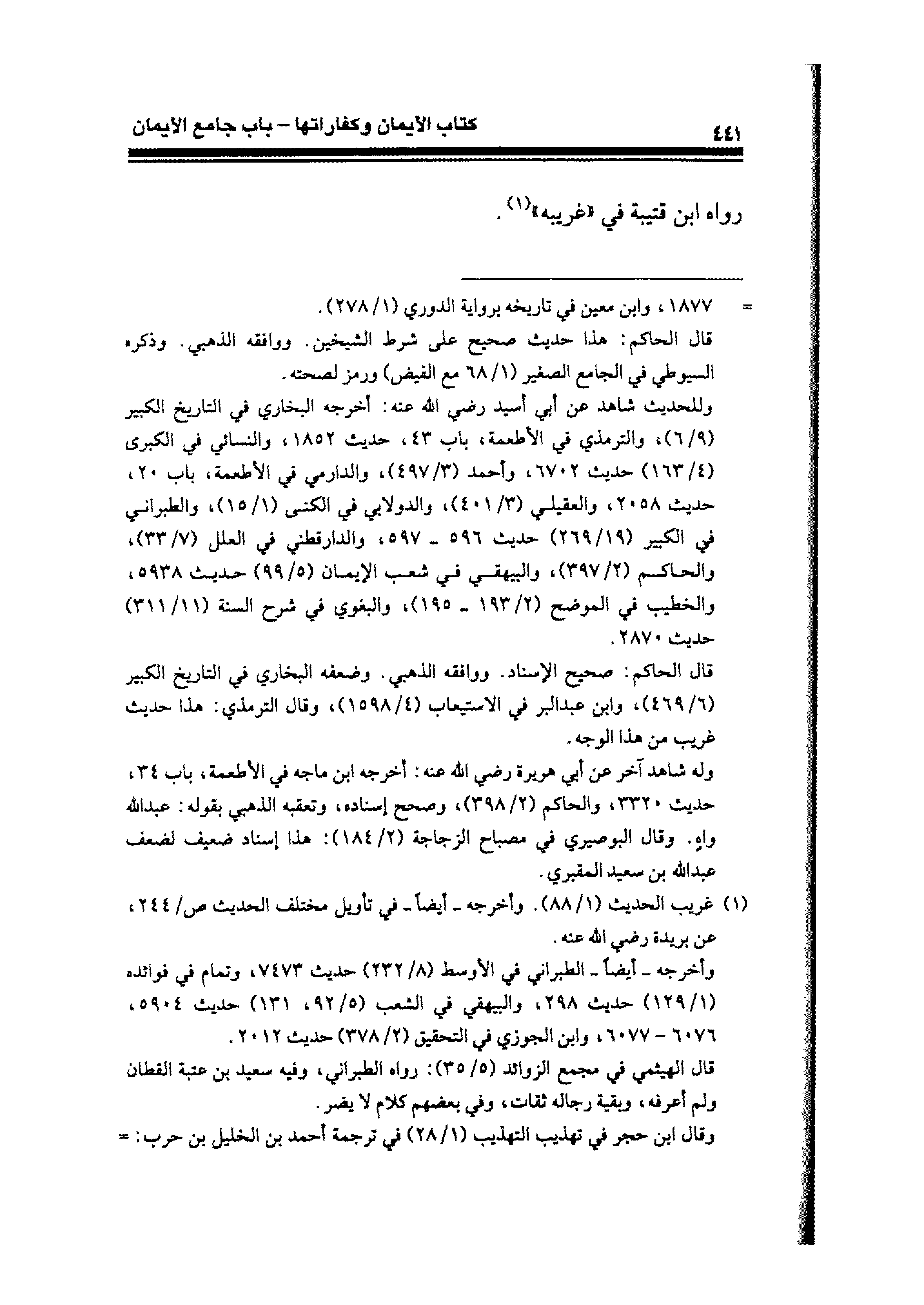 (¬١) غريب الحديث (١/ ٨٨). وأخرجه -أيضًا- في تأويل مختلف الحديث ص / ٢٤٤، عن بريدة - رضي الله عنه -.