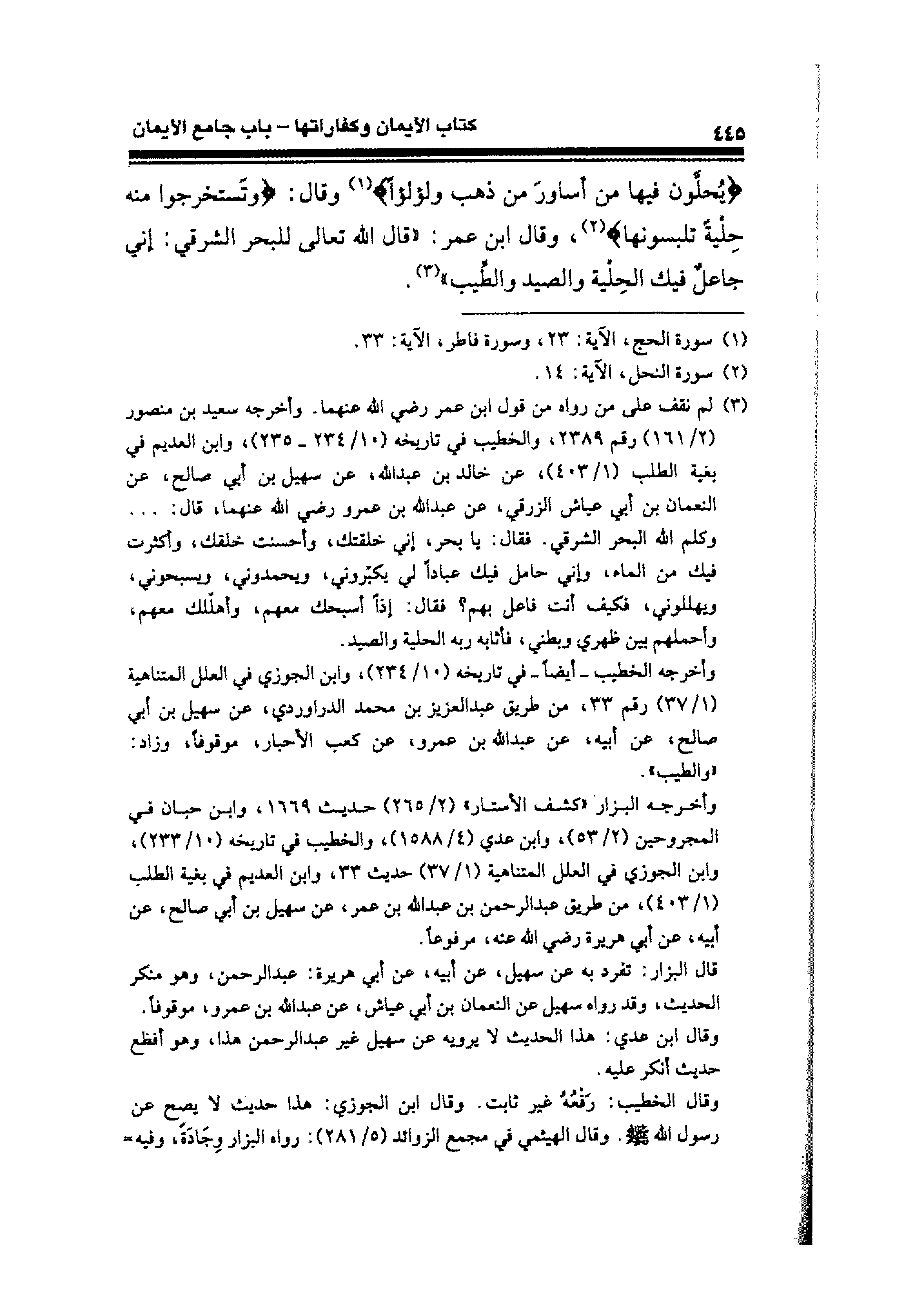 (¬٣) لم نقف على من رواه من قول ابن عمر رضي الله عنهما. وأخرجه سعيد بن منصور (٢/ ١٦١) رقم ٢٣٨٩، والخطيب في تاريخه (١٠/ ٢٣٤ - ٢٣٥)، وابن العديم في بغية الطلب (١/ ٤٠٣)، عن خالد بن عبد الله، عن سهيل بن أبي صالح، عن النعمان بن أبي عياش الزرقي، عن عبد الله بن عمرو رضي عنهما، قال: ... وكلم الله البحر الشرقي. فقال: يا بحر، إني خلقتك، وأحسنت خلقك، وأكثرت فيك من الماء، وإني حامل فيك عبادًا لي يكبروني، ويحمدوني، ويسبحوني، ويهللوني، فكيف أنت فاعل بهم؟ فقال: إذا أسبحك معهم، وأهلك معهم، وأحملهم بين ظهري وبطني، فأثابه ربه الحلية والصيد.