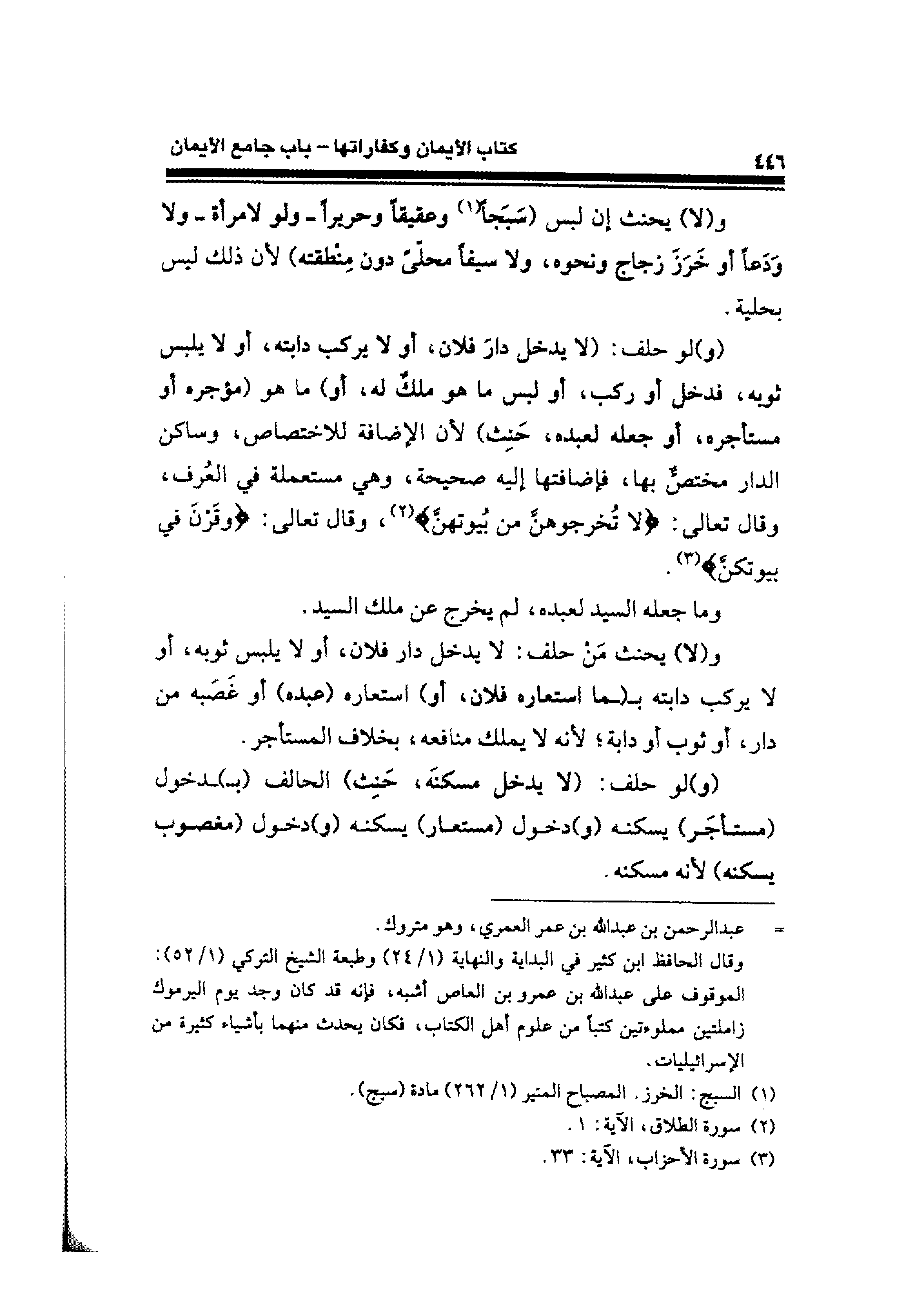 (و) لو حلف: (لا يدخل دارَ فلان، أو لا يركب دابته، أو لا يلبس ثوب، فدخل أو ركب، أو لبس ما هو ملكٌ له، أو) ما هو (مؤجره أو مستأجره، أو جعله لعبده، حَنِث) لأن الإضافة للاختصاص، وساكن الدار مختصٌّ بها، فإضافتها إليه صحيحة، وهي مستعملة في العُرف، وقال تعالى: {لَا تُخْرِجُوهُنَّ مِنْ بُيُوتِهِنَّ} (¬٢)، وقال تعالى: {وَقَرْنَ فِي بُيُوتِكُنَّ} (¬٣).