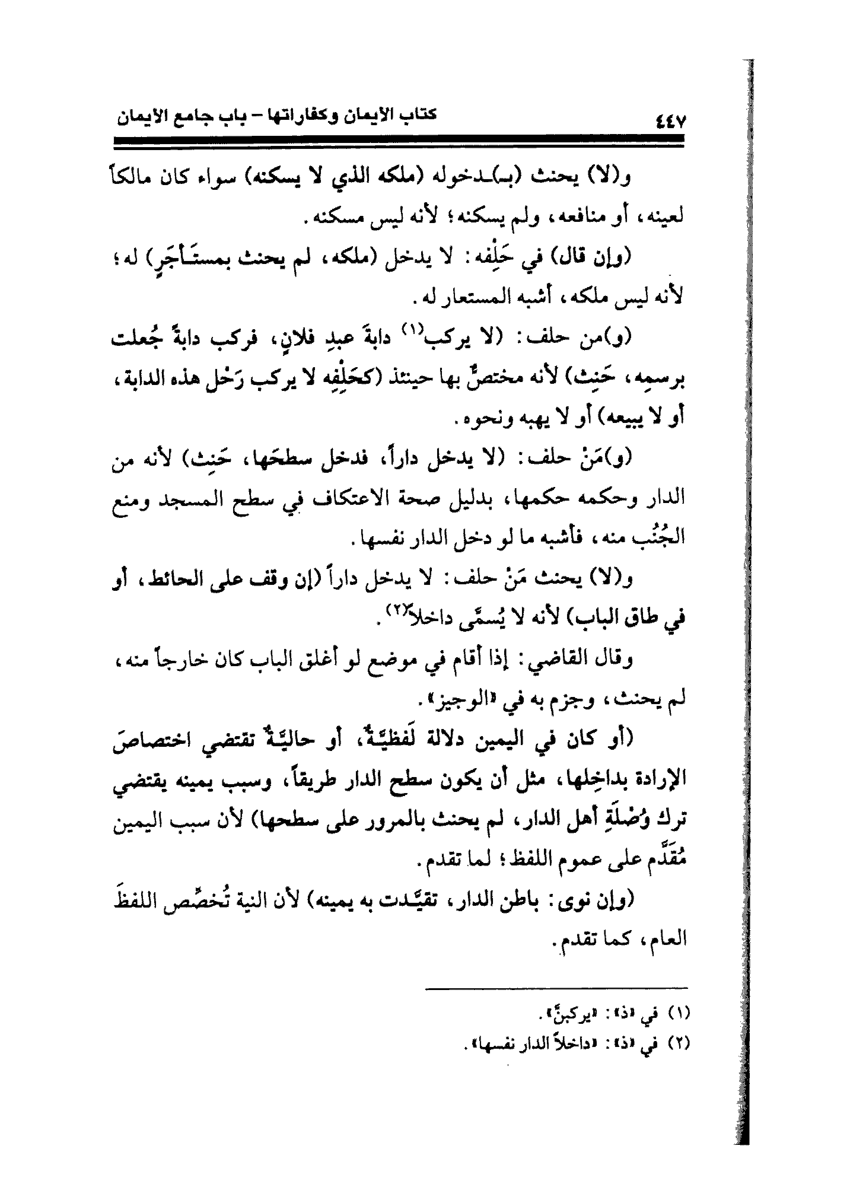 (و) مَنْ حلف: (لا يدخل دارًا، فدخل سطحَها، حَنِث) لأنه من الدار وحكمه حكمها، بدليل صحة الاعتكاف في سطح المسجد ومنع الجُنُب منه، فأشبه ما لو دخل الدار نفسها.