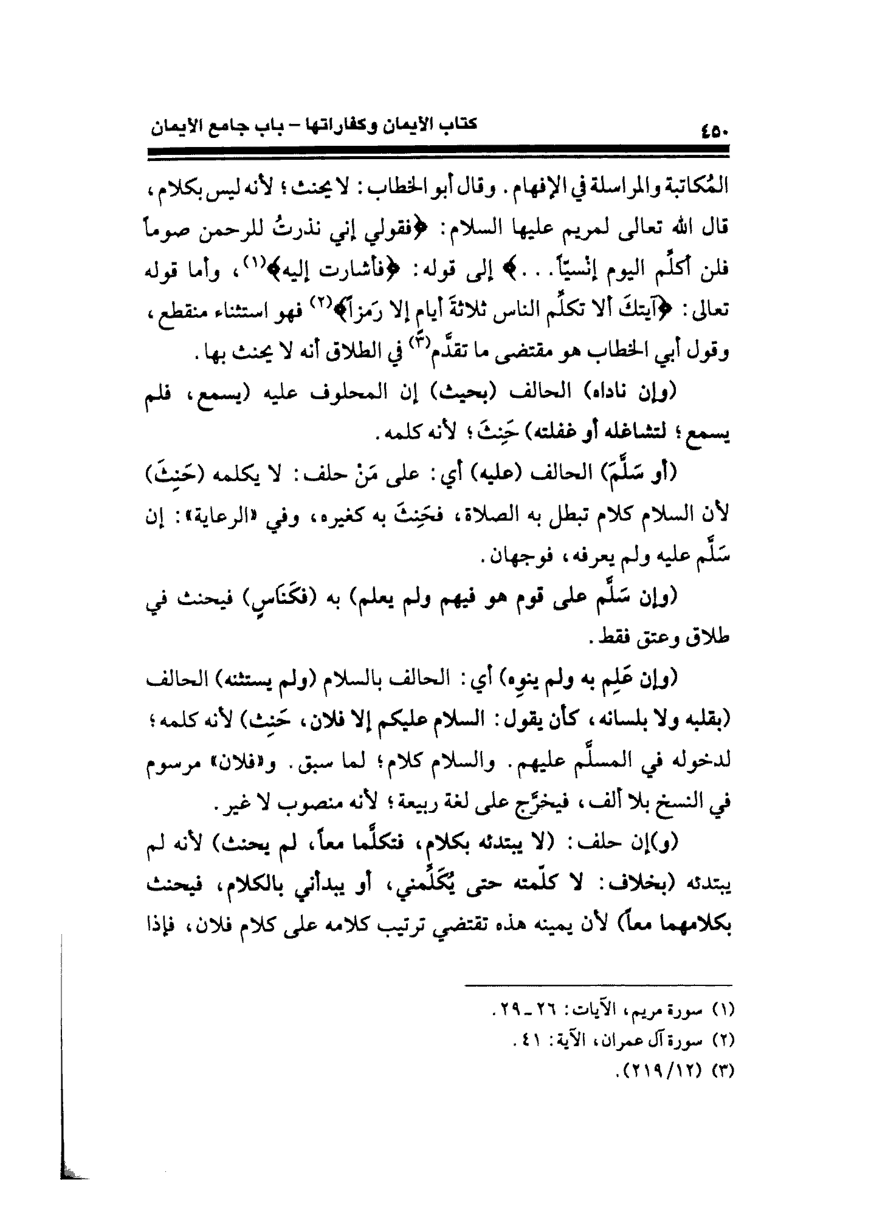 المُكاتبة والمراسلة في الإفهام. وقال أبو الخطاب: لا يحنث؛ لأنه ليس بكلام، قال الله تعالى لمريم عليها السلام: {فَقُولِي إِنِّي نَذَرْتُ لِلرَّحْمَنِ صَوْمًا فَلَنْ أُكَلِّمَ الْيَوْمَ إِنْسِيًّا ... } إلى قوله: {فَأَشَارَتْ إِلَيْهِ} (¬١)، وأما قوله تعالى: {آيَتُكَ أَلَّا تُكَلِّمَ النَّاسَ ثَلَاثَةَ أَيَّامٍ إِلَّا رَمْزًا} (¬٢) فهو استثناء منقطع، وقول أبي الخطاب هو مقتضى ما تقدَّم (¬٣) في الطلاق أنه لا يحنث بها.