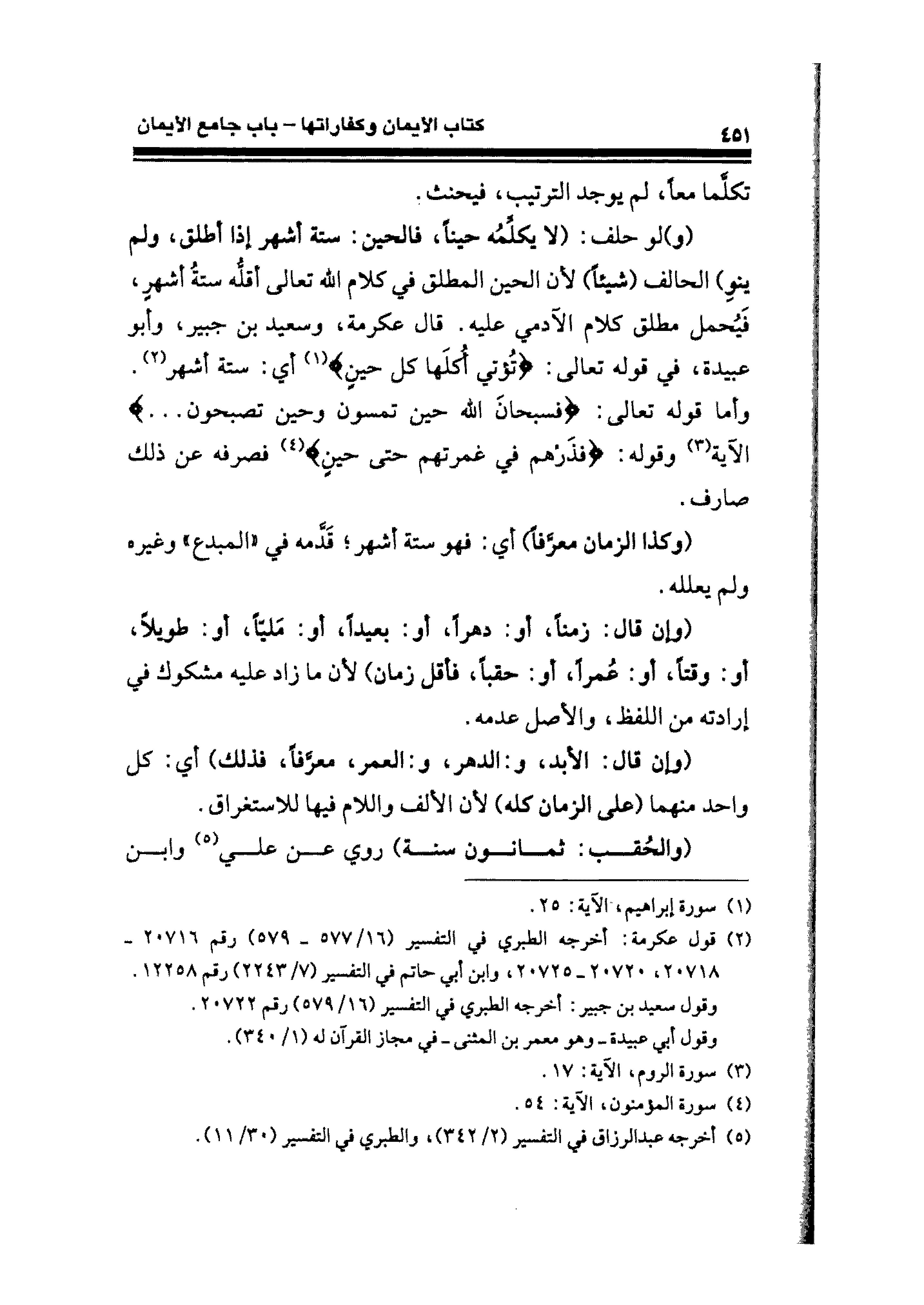 (و) لو حلف: (لا يكلِّمُه حينًا، فالحين: ستة أشهر إذا أطلق، ولم ينوِ) الحالف (شيئًا) لأن الحين المطلق في كلام الله تعالى أقلُّه ستةُ أشهرٍ، فَيُحمل مطلق كلام الآدمي عليه. قال عكرمة، وسعيد بن جبير، وأبو عبيدة، في قوله تعالى: {تُؤتِي أُكُلَهَا كُلَّ حِينٍ} (¬١) أي: ستة أشهر (¬٢). وأما قوله تعالى: {سبحانَ الله حين تمسون وحين تصبحون ... } الآية (¬٣) وقوله: {فذرْهم في غمرتهم حتى حينٍ} (¬٤) فصرفه عن ذلك صارف.