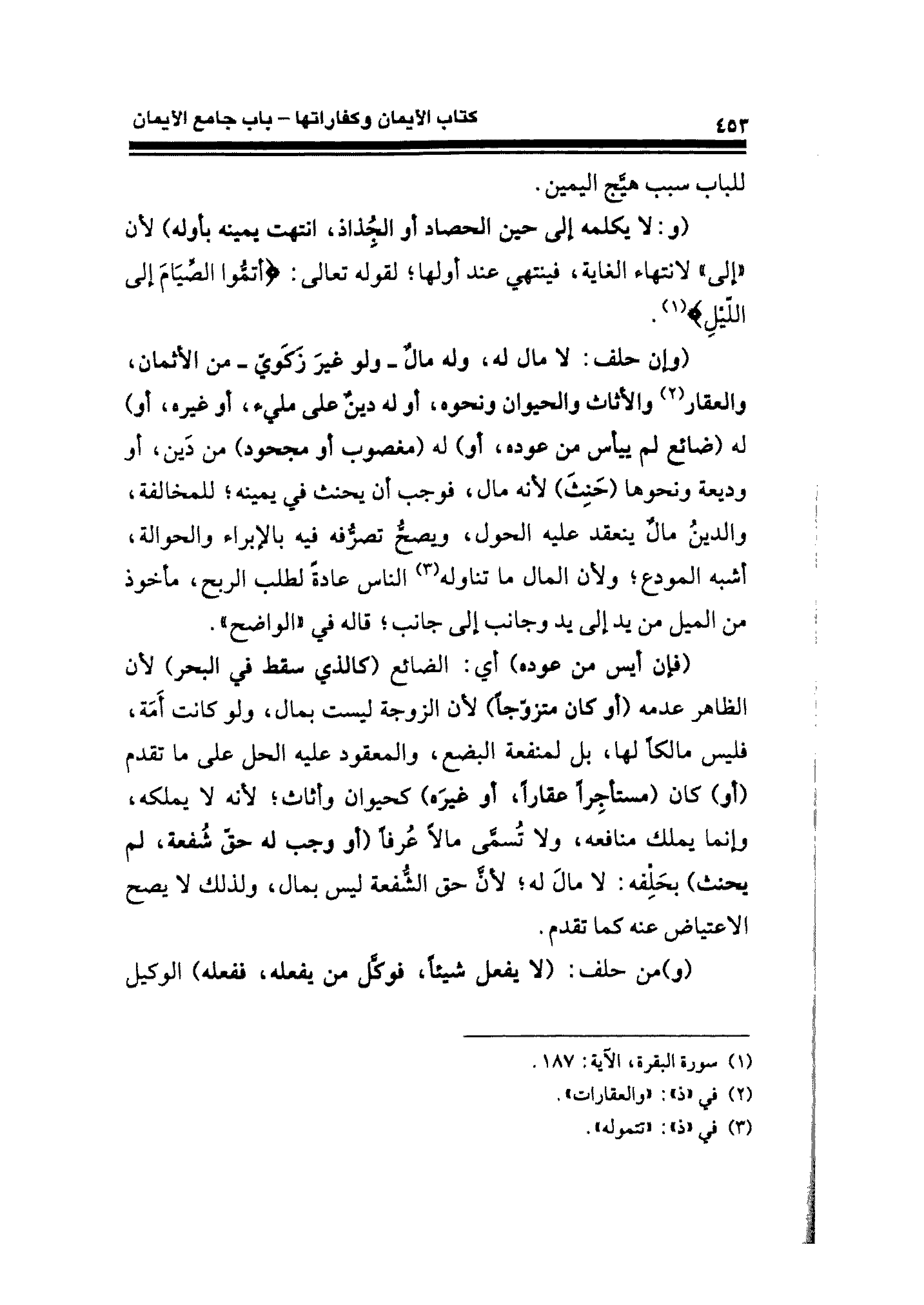 (و: لا يكلمه إلى حين الحصاد أو الجُذاذ، انتهت بمينه بأوله) لأن "إلى" لانتهاء الغاية، فينتهي عند أولها؛ لقوله تعالى: {أَتِمُّوا الصِّيَامَ إِلَى اللَّيلِ} (¬١).