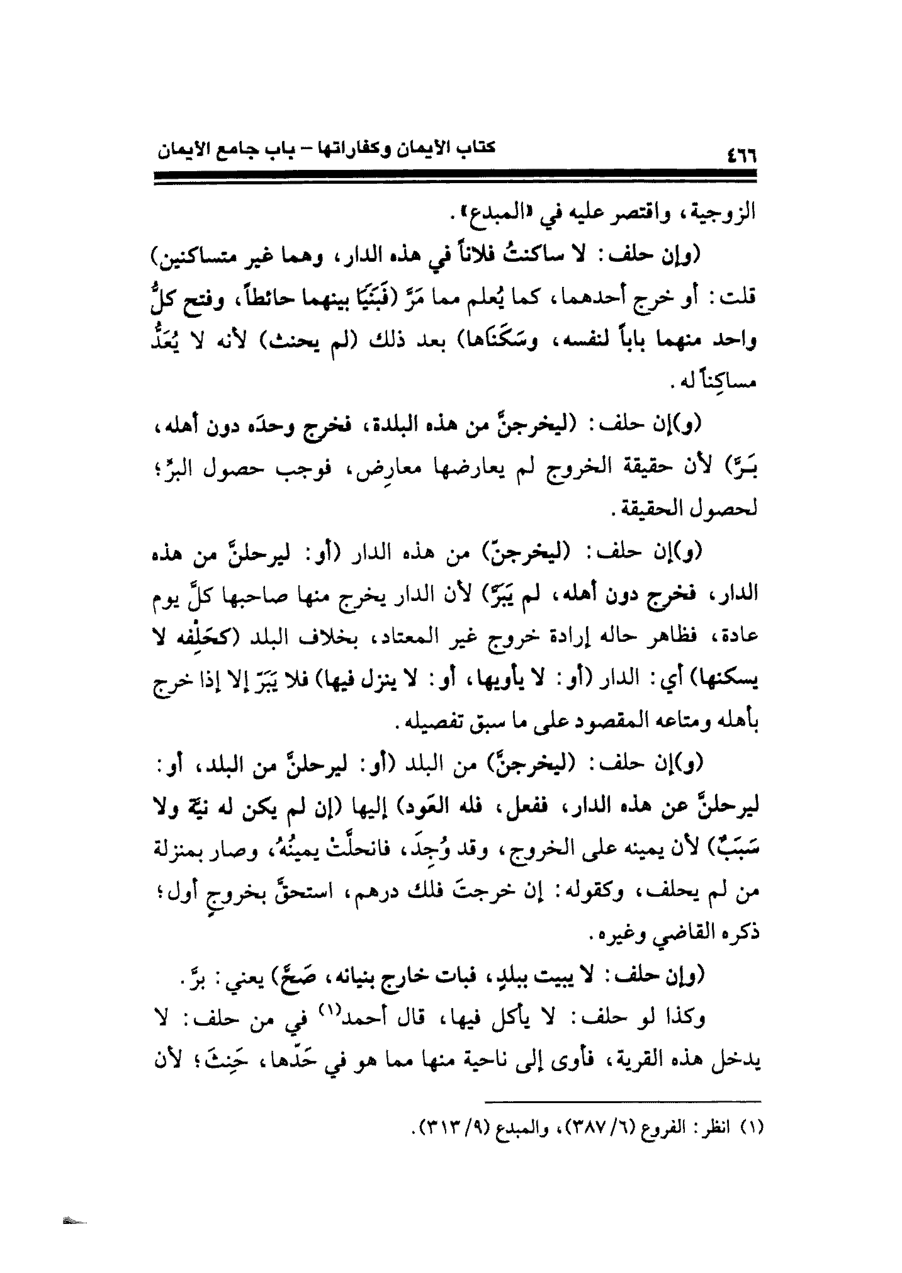 (و) إن حلف: (ليخرجنّ) من هذه الدار (أو: ليرحلنَّ من هذه الدار، فخرج دون أهله، لم يَبَرَّ) لأن الدار يخرج منها صاحبها كلَّ يوم عادة، فظاهر حاله إرادة خروج غير المعتاد، بخلاف البلد (كحَلْفه لا يسكنها) أي: الدار (أو: لا يأويها، أو: لا ينزل فيها) فلا يَبَرّ إلا إذا خرج بأهله ومتاعه المقصود على ما سبق تفصيله.