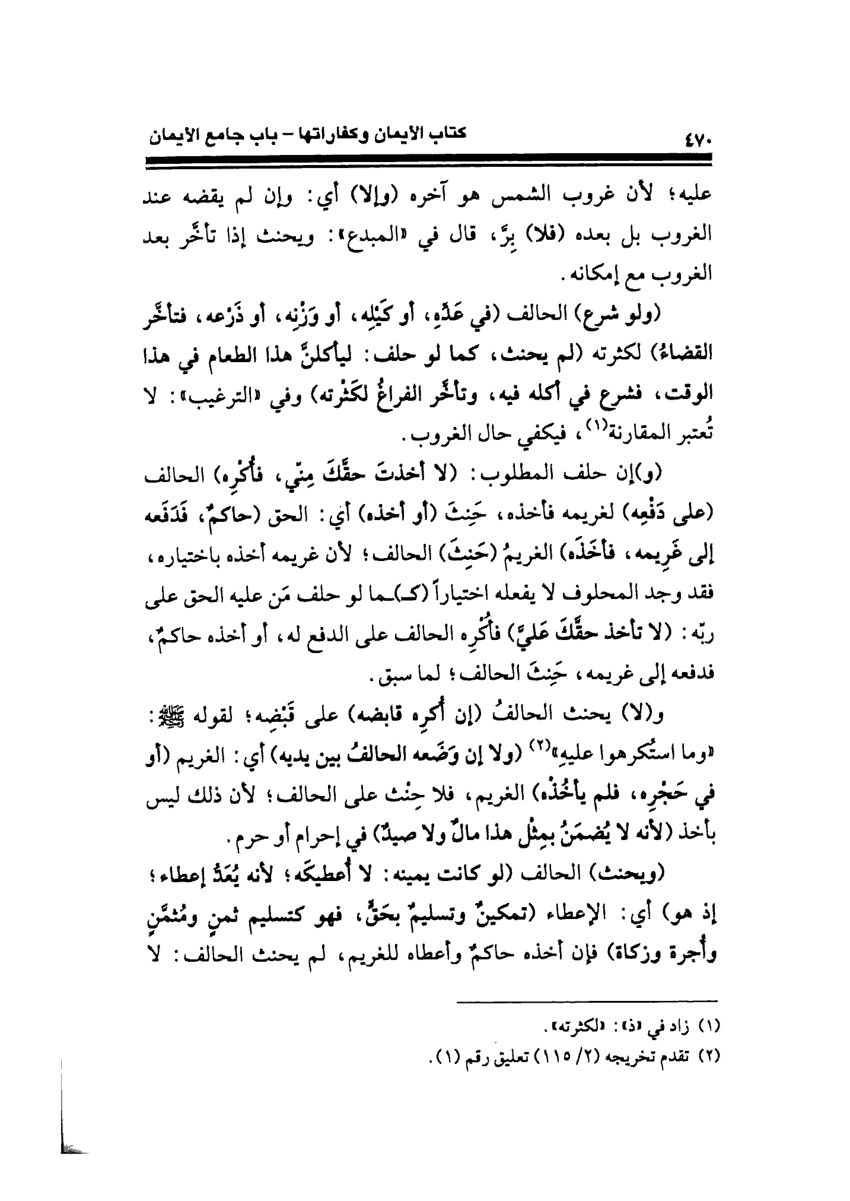 (ولو شرع) الحالف (في عَدِّهِ، أو كَيْلِه، أو وَزْنِه، أو ذَرْعه، فتأخَّر القضاءُ) لكثرته (لم يحنث، كما لو حلف: ليأكلنَّ هذا الطعام في هذا الوقت، فشرع في أكله فيه، وتأخَّر الفراغُ لكَثْرته) وفي "الترغيب": لا تُعتبر المقارنة (¬١)، فيكفي حال الغروب.