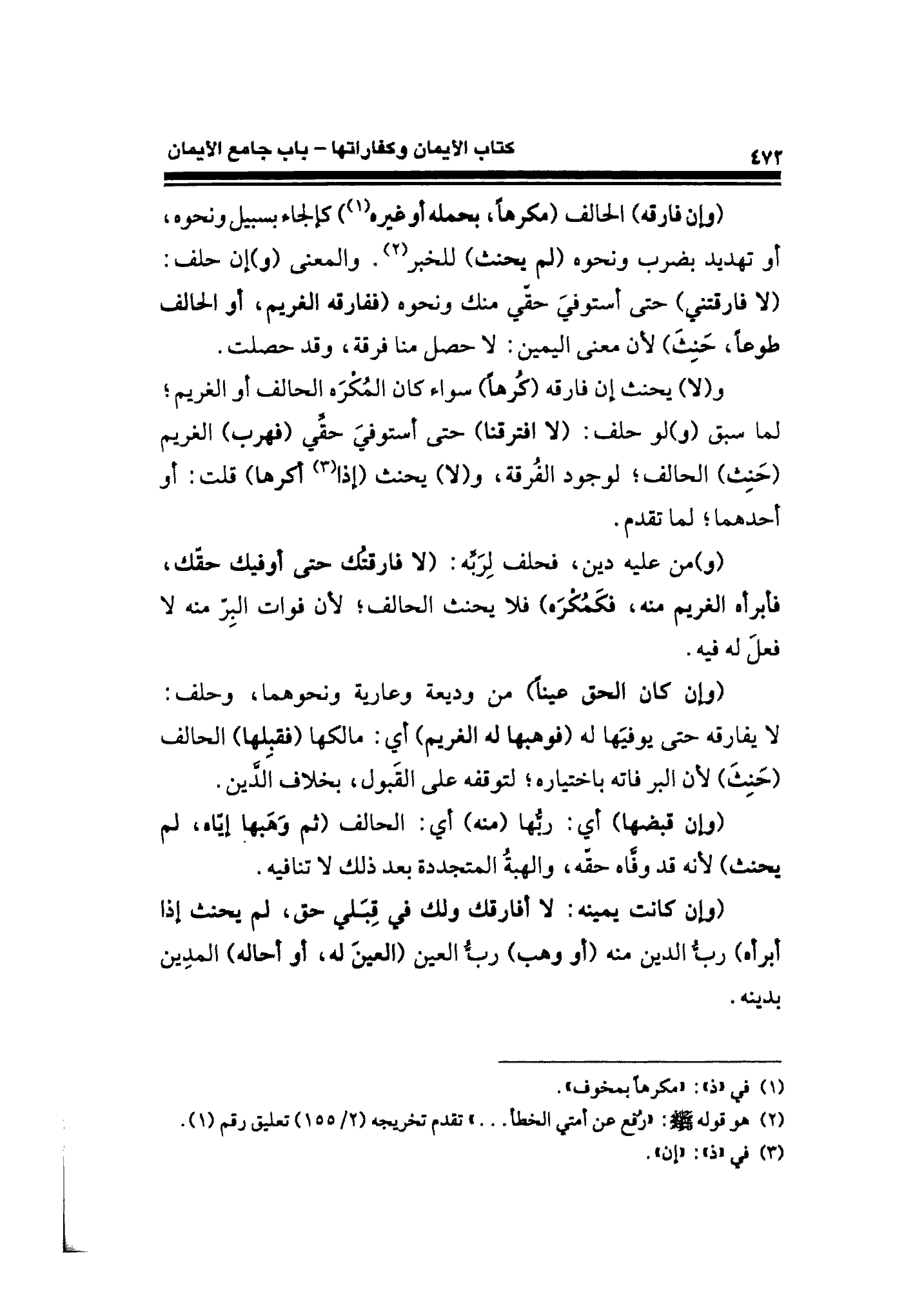 (وإن فارقه) الحالف (مكرهًا، بحمله أو غيره (¬١)) كإلجاء بسبيل ونحوه، أو تهديد بضرب ونحوه (لم يحنث) للخبر (¬٢). والمعنى (و) إن حلف: (لا فارقتني) حتى أستوفيَ حقّي منك ونحوه (ففارقه الغريم، أو الحالف طوعًا، حَنِثَ) لأن معنى اليمين: لا حصل منا فرقة، وقد حصلت.