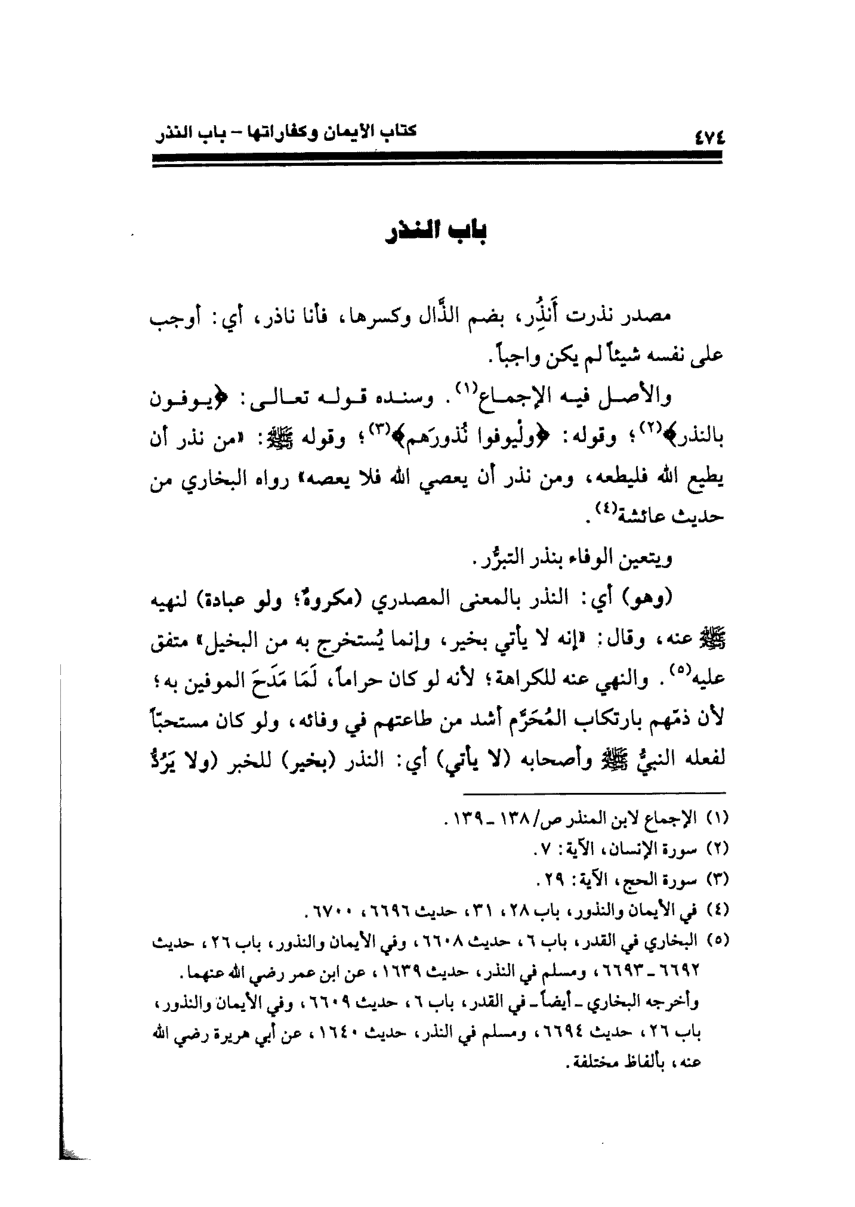 والأصل فيه الإجماع (¬١). وسنده قوله تعالى: {يُوفُونَ بِالنَّذْرِ} (¬٢)؛ وقوله: {وَلْيُوفُوا نُذُورَهُمْ} (¬٣)؛ وقوله - صلى الله عليه وسلم -: "من نذر أن يطيع الله فليطعه، ومن نذر أن يعصي الله فلا يعصه" رواه البخاري من حديث عائشة (¬٤).