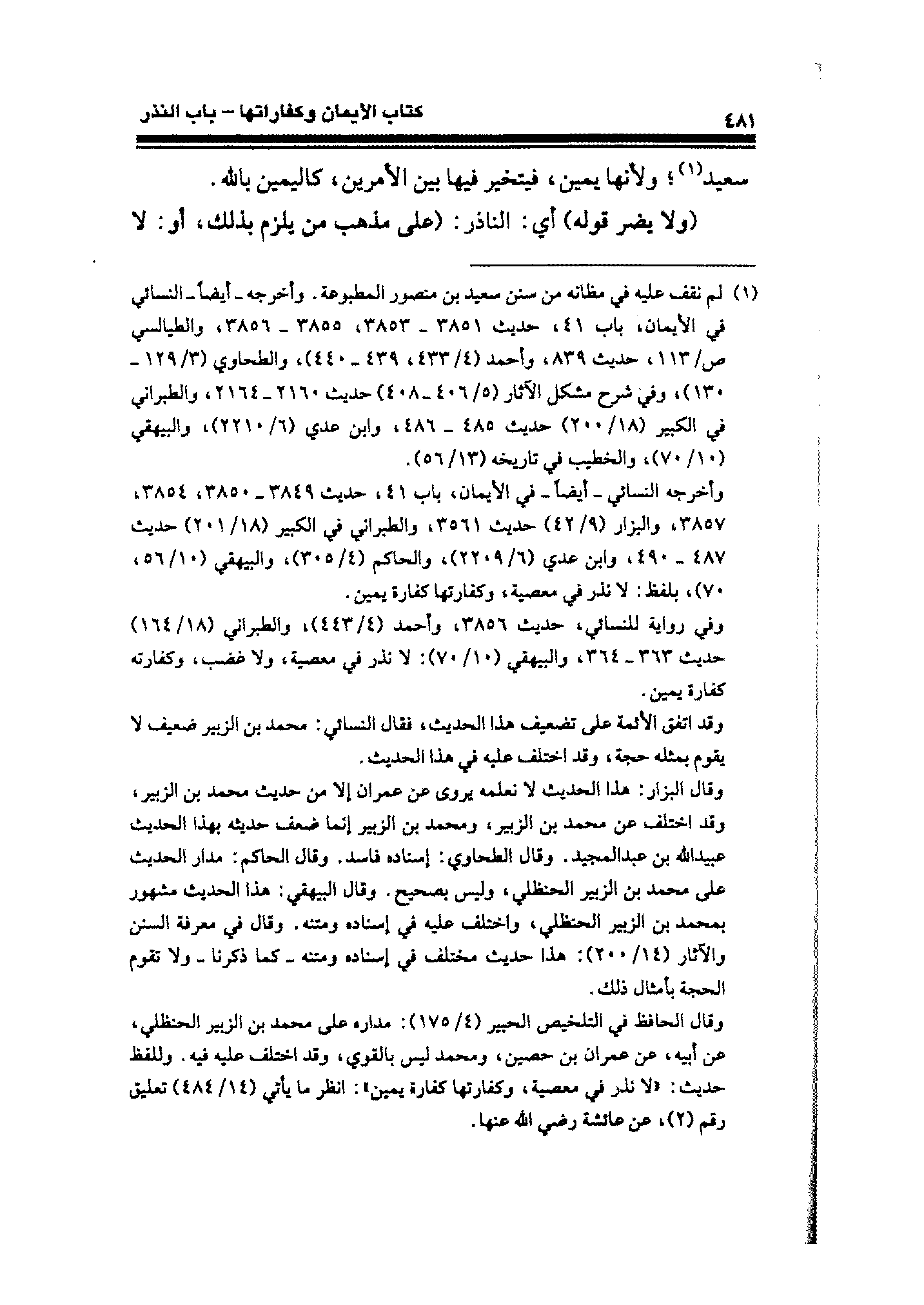 وقال الحافظ فِي التلخيص الحبير (٤/ ١٧٥): مداره على محمَّد بن الزُّبير الحنظلي، عن أبيه، عن عمران بن حصين، ومحمد ليس بالقوي، وقد اختلف عليه فيه. وللفظ حديث: "لا نذر في معصية، وكفارتها كفارة يمين": انظر ما يأتي (١٤/ ٤٨٤) تعليق رقم (٢)، عن عائشة رضي الله عنها.