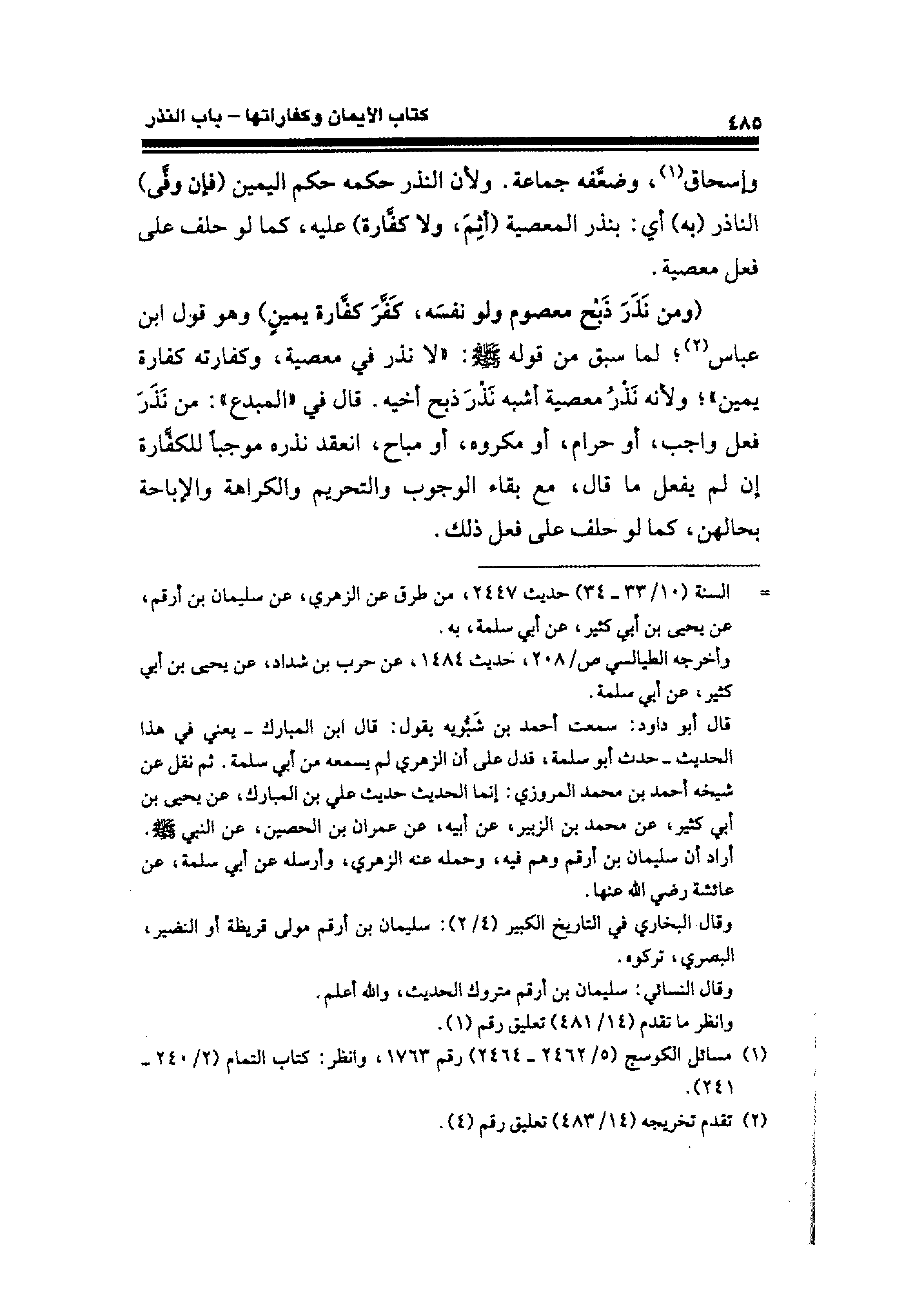 قال أبو داود: سمعت أَحْمد بن شَبُّويه يقول: قال ابن المبارك -يعني فِي هذا الحديث- حدث أبو سلمة، فدل على أن الزهري لم يسمعه من أبي سلمة. ثم نقل عن شيخه أَحْمد بن محمَّد المروزي: إنما الحديث حديث علي بن المبارك، عن يحيى بن أبِي كثير، عن محمَّد بن الزبير، عن أبيه، عن عمران بن الحصين، عن النبي - صلى الله عليه وسلم -. أراد أن سليمان بن أرقم وهم فِيه، وحمله عنه الزهري، وأرسله عن أبي سلمة، عن عائشة رضي الله عنها.