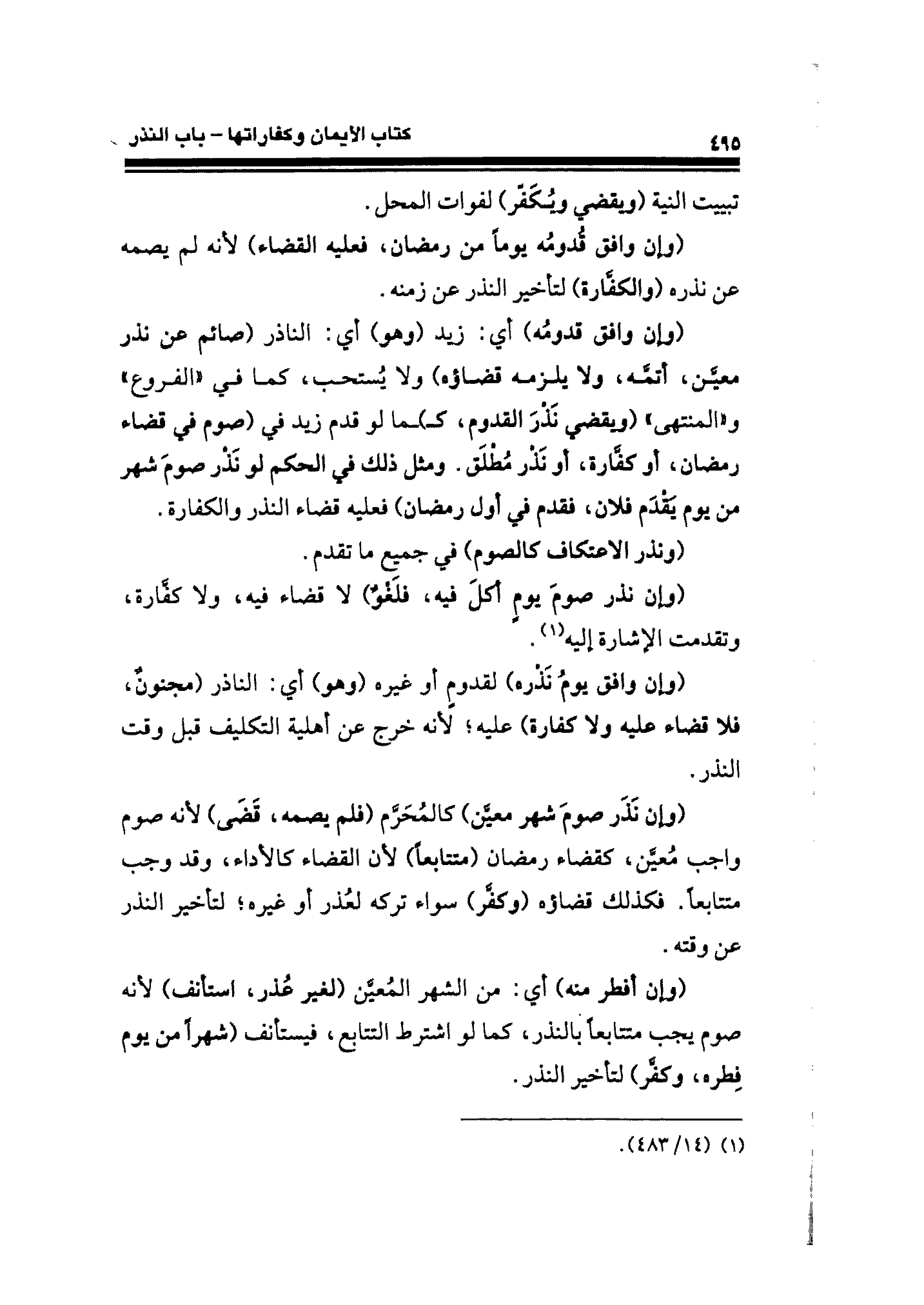 (وإن وافق قدومُه) أي: زيد (وهو) أي: الناذر (صائم عن نذر معيَّن، أتمَّه، ولا يلزمه قضاؤه) ولا يُستحب، كما في "الفروع" و"المنتهى" (ويقضي نَذرَ القدوم، كـ) ـما لو قدم زيد في (صوم في قضاء رمضان، أو كفَّارة، أو نَذر مُطلَق. ومثل ذلك في الحكم لو نَذر صومَ شهر من يوم يَقْدَم فلان، فقدم في أول رمضان) فعليه قضاء النذر والكفارة.