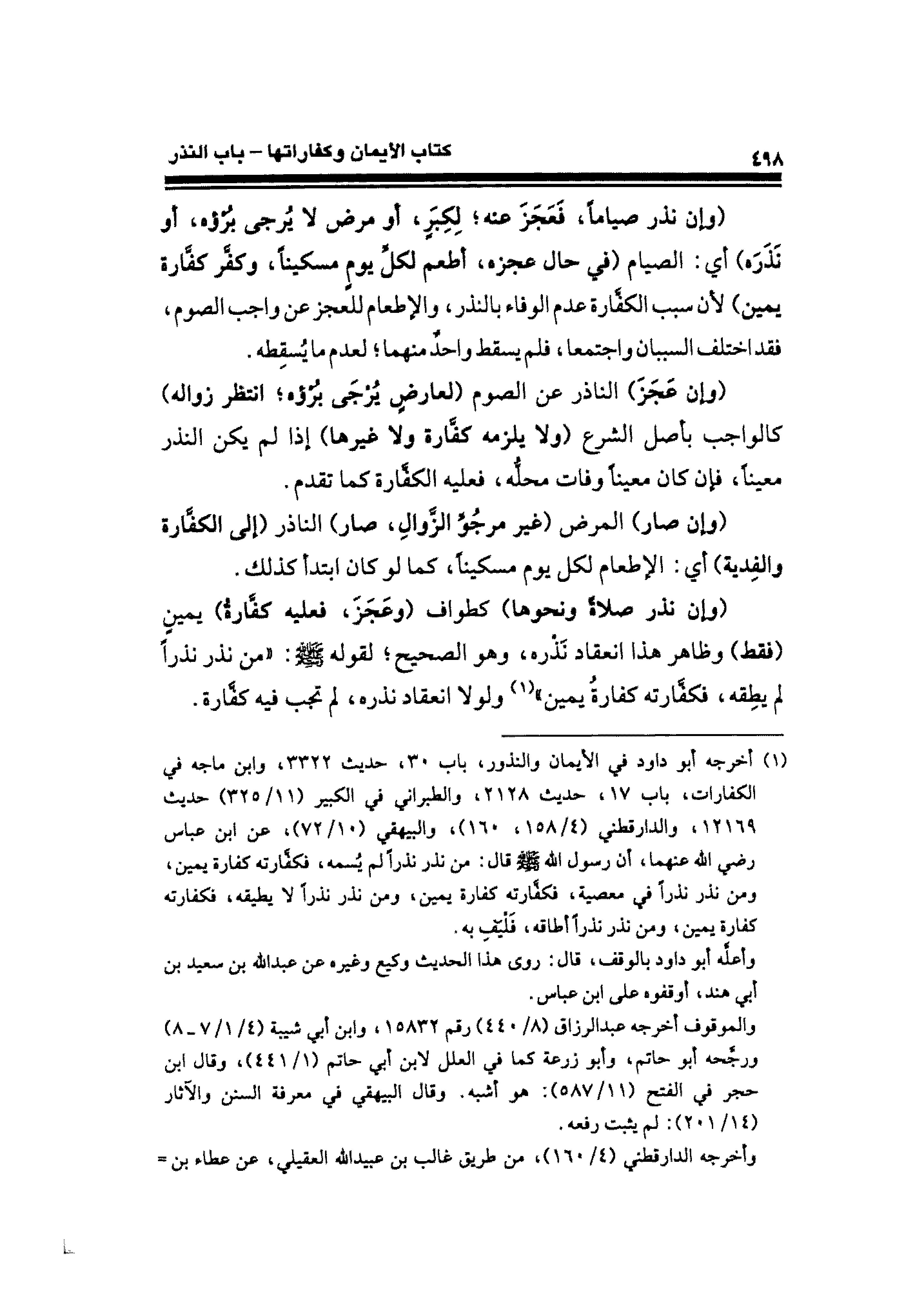 (¬١) أخرجه أبو داود في الأيمان والنذور، باب ٣٠، حديث ٣٣٢٢، وابن ماجة في الكفارات، باب ١٧، حديث ٢١٢٨، والطبراني في الكبير (١١/ ٣٢٥) حديث ١٢١٦٩، والدارقطني (٤/ ١٥٨، ١٦٠) والبيهقي (١٠/ ٧٢)، عن ابن عباس رضي الله عنهما، أن رسول الله - صلى الله عليه وسلم - قال: من نذر نذرًا لم يُسمه، فكفَّارته كفارة يمين، ومن نذر نذرًا في معصية، فكفَّارته كفارة يمين، ومن نذر نذرًا لا يطيقه، فكفارته كفارة يمين، ومن نذر نذرًا أطاقه، فَلْيَفِ به،