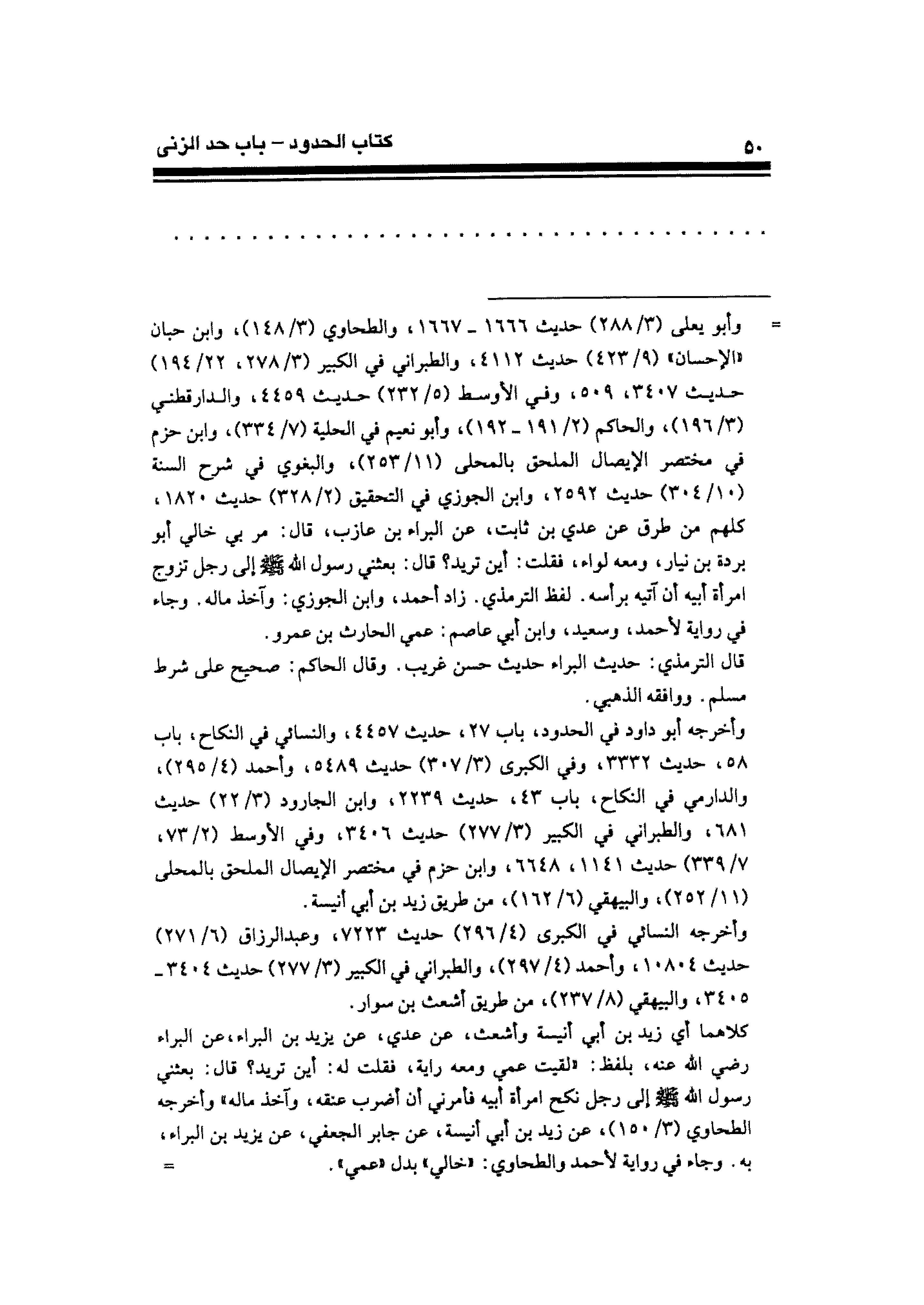 = وأبو يعلى (٣/ ٢٨٨) حديث ١٦٦٦ - ١٦٦٧، والطحاوي (٣/ ١٤٨)، وابن حبان "الإحسان" (٩/ ٤٢٣) حديث ٤١١٢، والطبراني في الكبير (٣/ ٢٧٨، ٢٢/ ١٩٤) حديث ٣٤٠٧، ٥٠٩، وفي الأوسط (٥/ ٢٣٢) حديث ٤٤٥٩، والدارقطني (٣/ ١٩٦)، والحاكم (٢/ ١٩١ - ١٩٢)، وأبو نعيم في الحلية (٧/ ٣٣٤)، وابن حزم في مختصر الإيصال الملحق بالمحلى (١١/ ٢٥٣)، والبغوي في شرح السنة (١٠/ ٣٠٤) حديث ٢٥٩٢، وابن الجوزي في التحقيق (٢/ ٣٢٨) حديث ١٨٢٠، كلهم من طرق عن عدي بن ثابت، عن البراء بن عازب، قال: مر بي خالي أبو بردة بن نيار، ومعه لواء، فقلت: أين تريد؟ قال: بعثني رسول الله - صلى الله عليه وسلم - إلى رجل تزوج امرأة أبيه أن آتيه برأسه. لفظ الترمذي. زاد أحمد، وابن الجوزي: وآخذ ماله. وجاء في رواية لأحمد، وسعيد، وابن أبي عاصم: عمي الحارث بن عمرو.