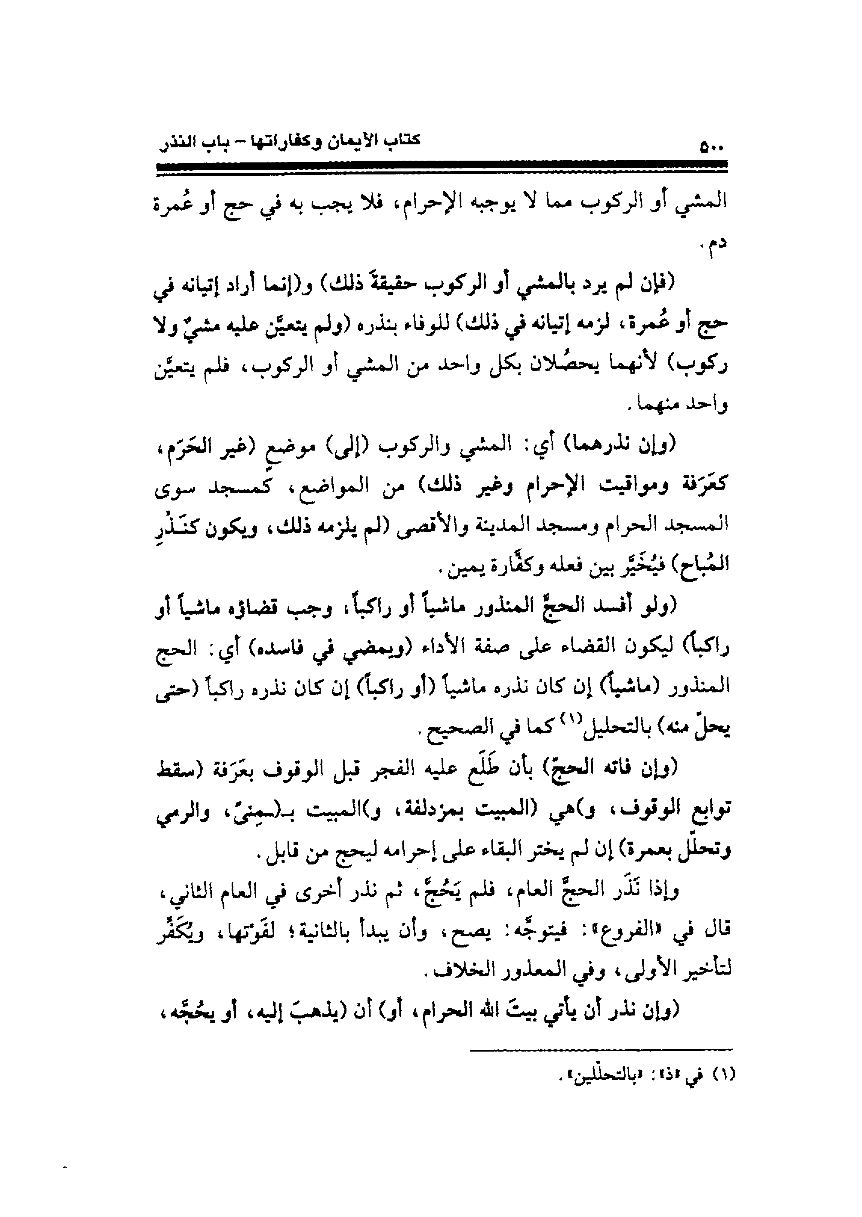 (وإن نذرهما) أي: المشي والركوب (إلى) موضعٍ (غير الحَرَم، كعَرَفة ومواقيت الإحرام وغير ذلك) من المواضع، كمسجد سوى المسجد الحرام ومسجد المدينة والأقصى (لم يلزمة ذلك، ويكون كنَذْرِ المُباح) فيُخَيَّر بين فعله وكفارة يمين.