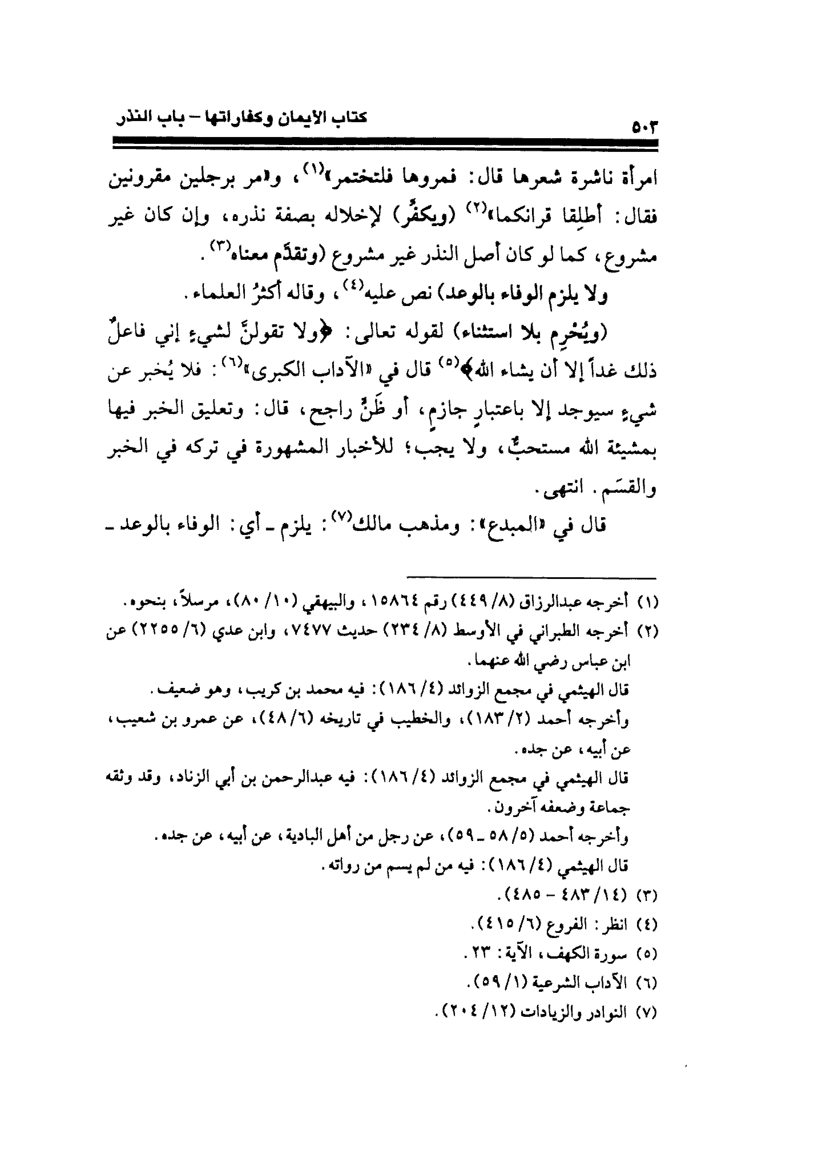امرأة ناشرة شعرها قال: فمروها فلتختمر" (¬١)، و "مر برجلين مقرونين فقال: أطلِقا قرانكما" (¬٢) (ويكفِّر) لإخلاله بصفة نذره، وإن كان غير مشروع، كما لو كان أصل النذر غير مشروع (وتقدَّم معناه (¬٣).