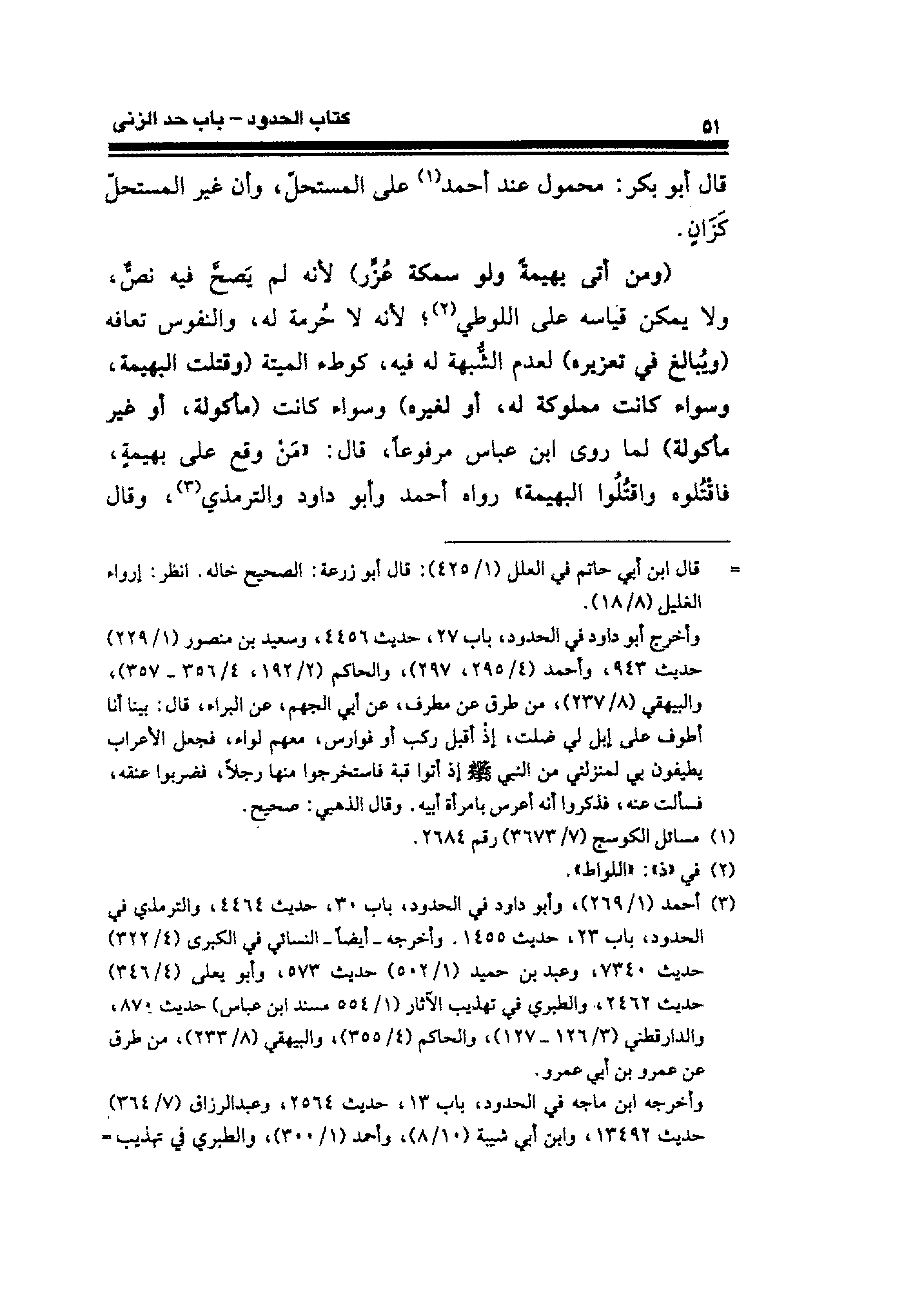 (ومن أتى بهيمةً ولو سمكة عُزِّر) لأنه لم يَصحَّ فيه نصٌّ، ولا يمكن قياسه على اللوطي (¬٢)؛ لأنه لا حُرمة له، والنفوس تعافه (ويُبالغ في تعزيره) لعدم الشُّبهة له فيه، كوطء الميتة (وقتلت البهيمة، وسواء كانت مملوكة له، أو لغيره) وسواء كانت (مأكولة، أو غير مأكولة) لما روى ابن عباس مرفوعًا، قال: (مَنْ وقع على بهيمةٍ، فاقْتُلوه واقتُلُوا البهيمة" رواه أحمد وأبو داود والترمذي (¬٣)، وقال