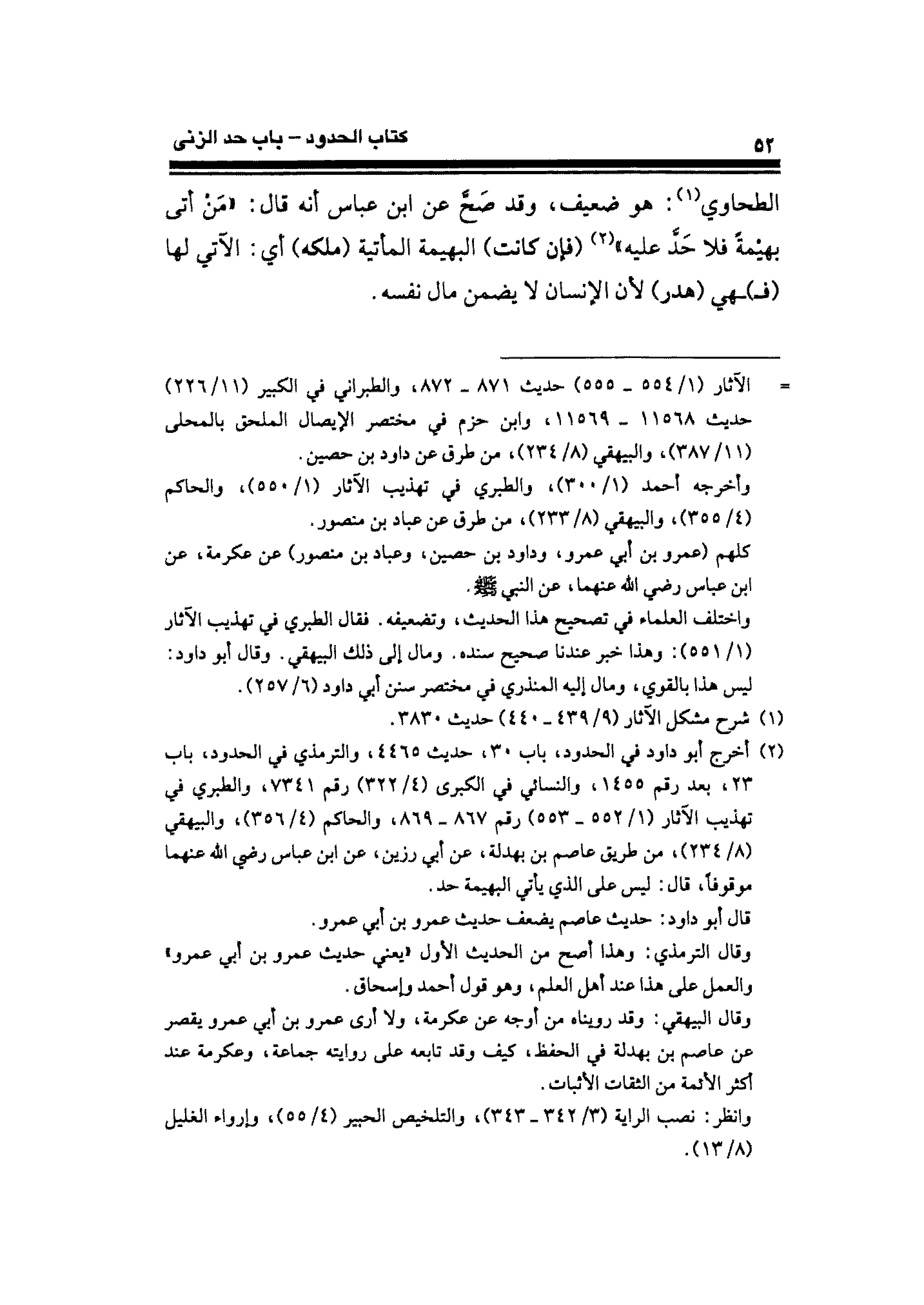 (¬٢) أخرج أبو داود في الحدود، باب ٣٠، حديث ٤٤٦٥، والترمذي في الحدود، باب ٢٣، بعد رقم ١٤٥٥، والنسائي في الكبرى (٤/ ٣٢٢) رقم ٧٣٤١، والطبري في تهذيب الآثار (١/ ٥٥٢ - ٥٥٣) رقم ٨٦٧ - ٨٦٩، والحاكم (٤/ ٣٥٦)، والبيهقي (٨/ ٢٣٤)، من طريق عاصم بن بهدلة، عن أبي رزين، عن ابن عباص رضي الله عنهما موقوفًا، قال: ليس على الذي يأتي البهيمة حد.