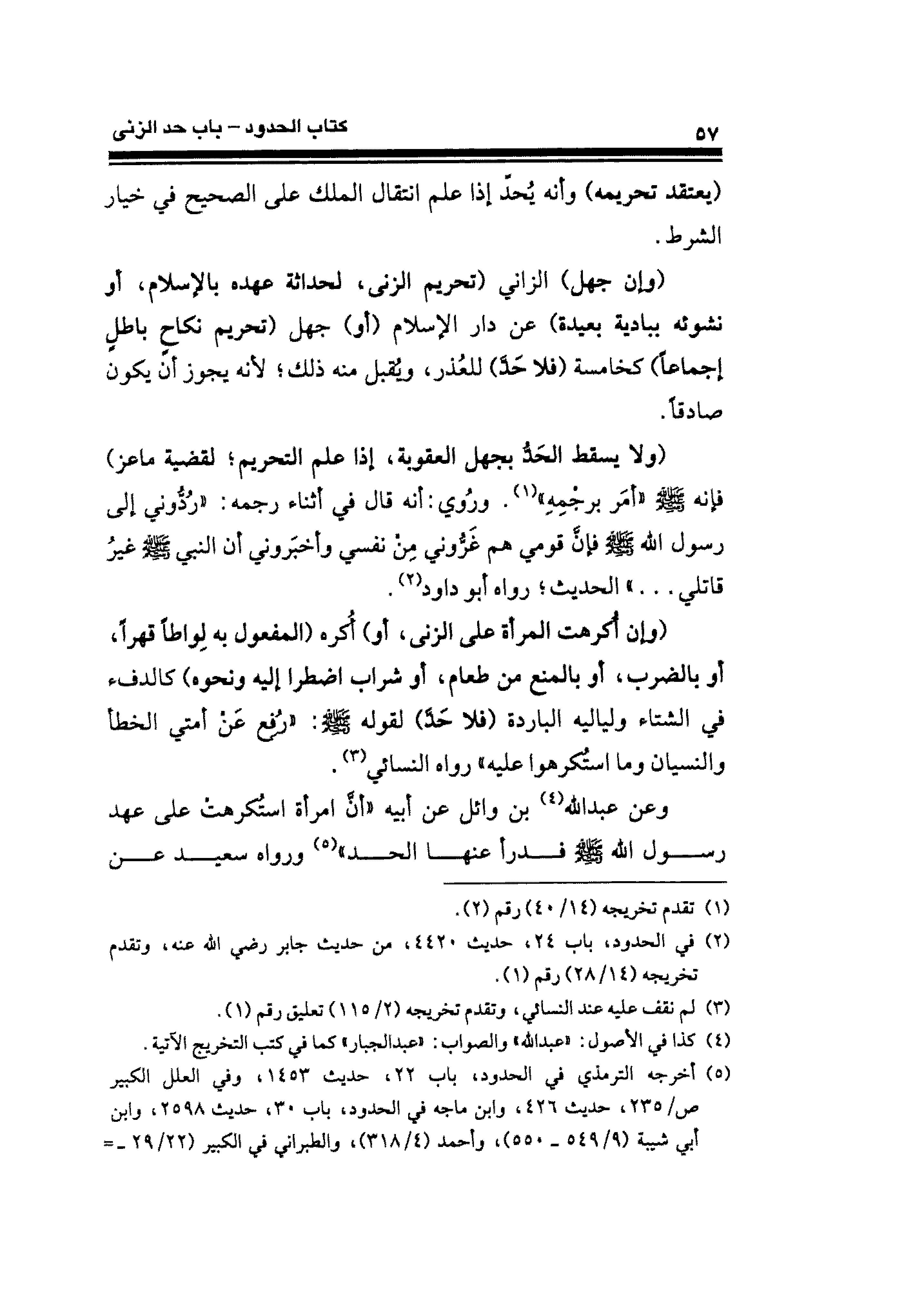 (وإن جهل) الزانى (تحريم الزنى، لحداثة عهده بالإسلام، أو نشرئه بباية بعيدة) عن دار الإسلام (أو) جهل (تحريم نكاح باطلٍ إجماعًا) كخامسة (فلا حَدَّ) للعُذر، ويُقبل منه ذلك؛ لأنه يجوز أن يكون صادقًا.