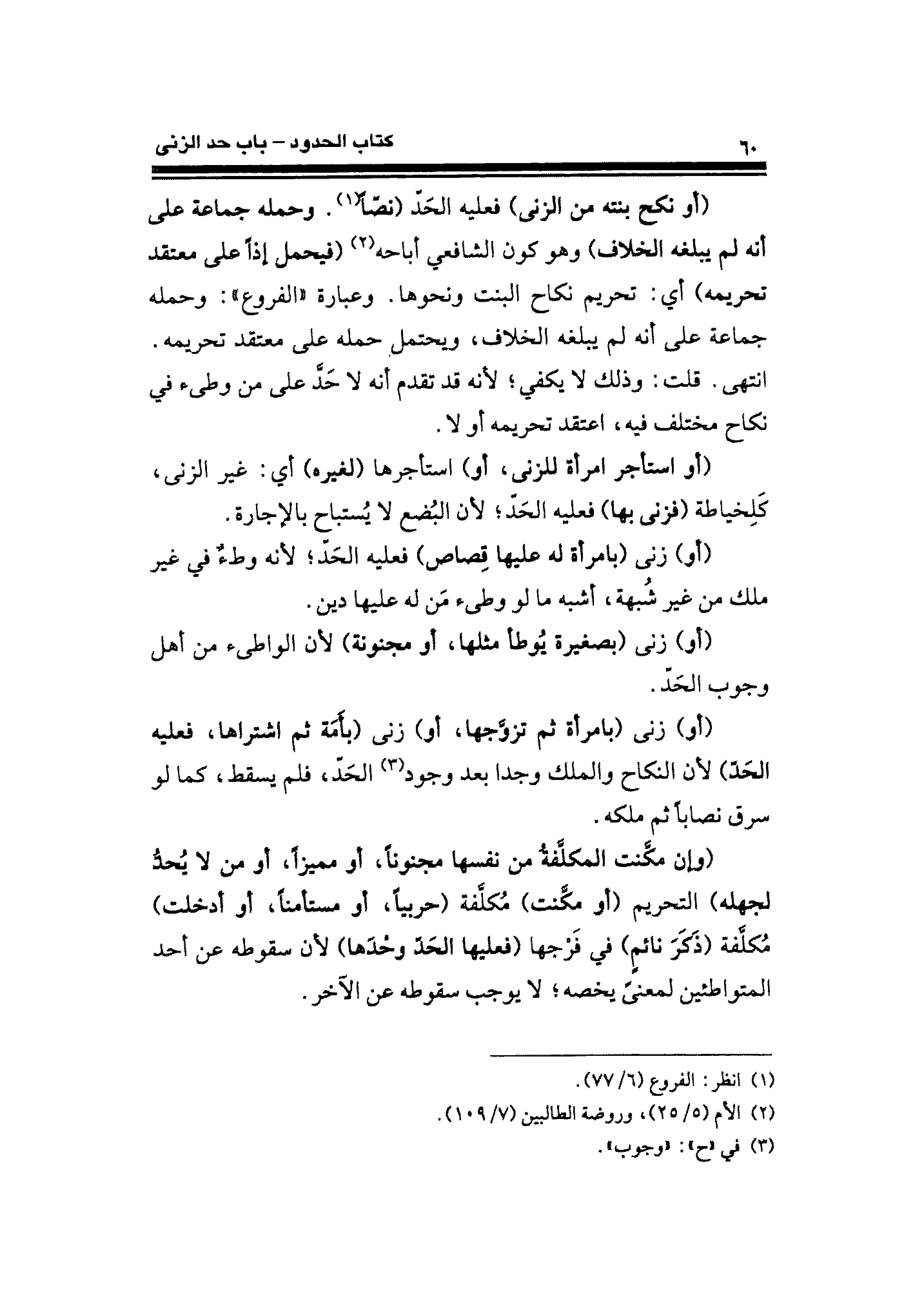 (أو نكح بنته من الزنى) فعليه الحَدّ (نصًّا (¬١). وحمله جماعة على أنه لم يبلغه الخلاف) وهو كون الشافعي أباحه (¬٢) (فيحمل إذًا على معتقد تحريمه) أي: تحريم نكاح البنت ونحوها. وعبارة "الفروع": وحمله جماعة على أنه لم يبلغه الخلاف، ويحتمل حمله على معتقد تحريمه. انتهى. قلت: وذلك لا يكفي؛ لأنه قد تقدم أنه لا حَدَّ على من وطئ في نكاح مختلف فيه، اعتقد تحريمه أو لا.