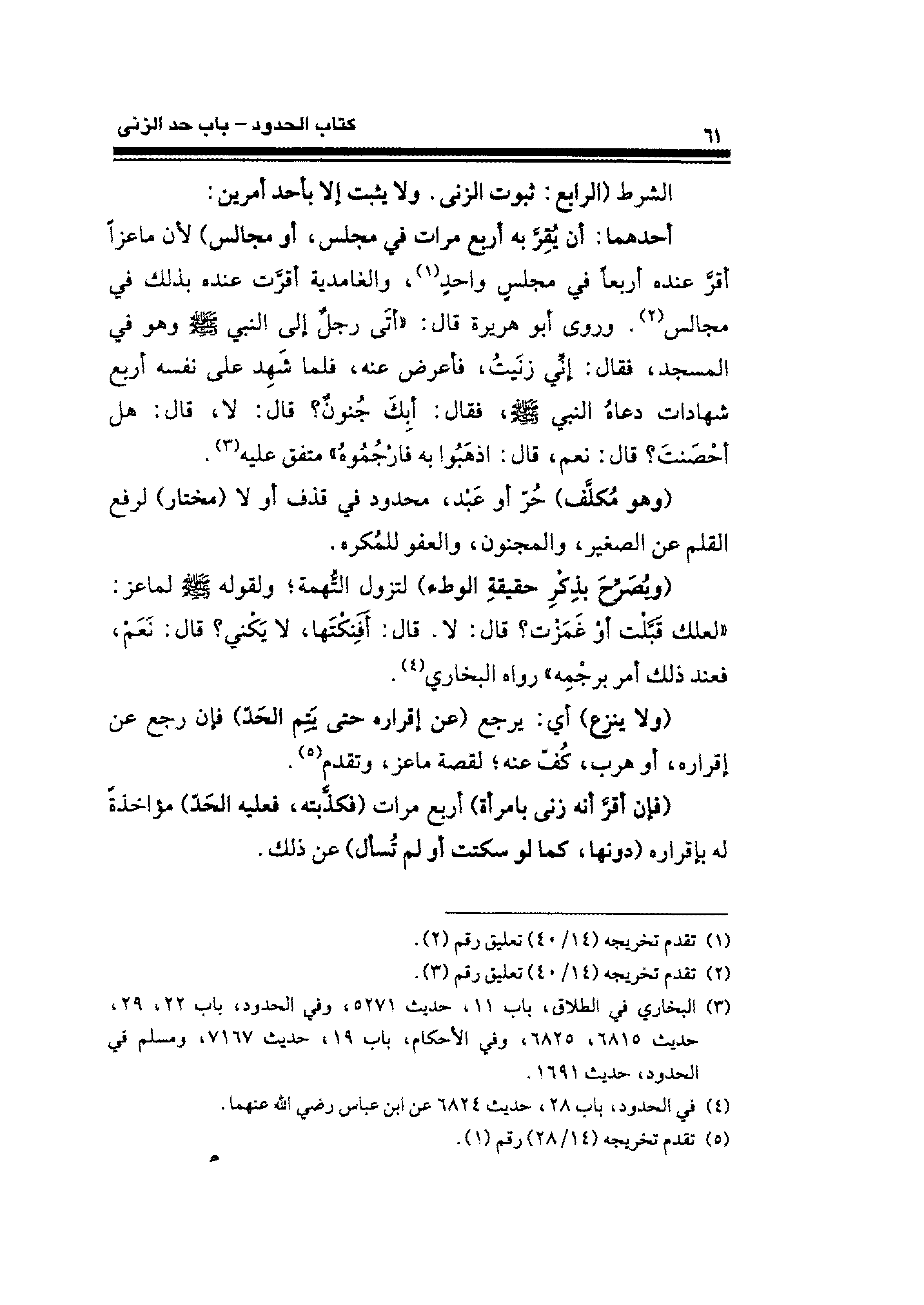(¬٣) البخاري في الطلاق، باب ١١، حديث ٥٢٧١، وفي الحدود، باب ٢٢، ٢٩، حديث ٦٨١٥، ٦٨٢٥، وفي الأحكام، باب ١٩، حديث ٧١٦٧، ومسلم في الحدود، حديث ١٦٩١.