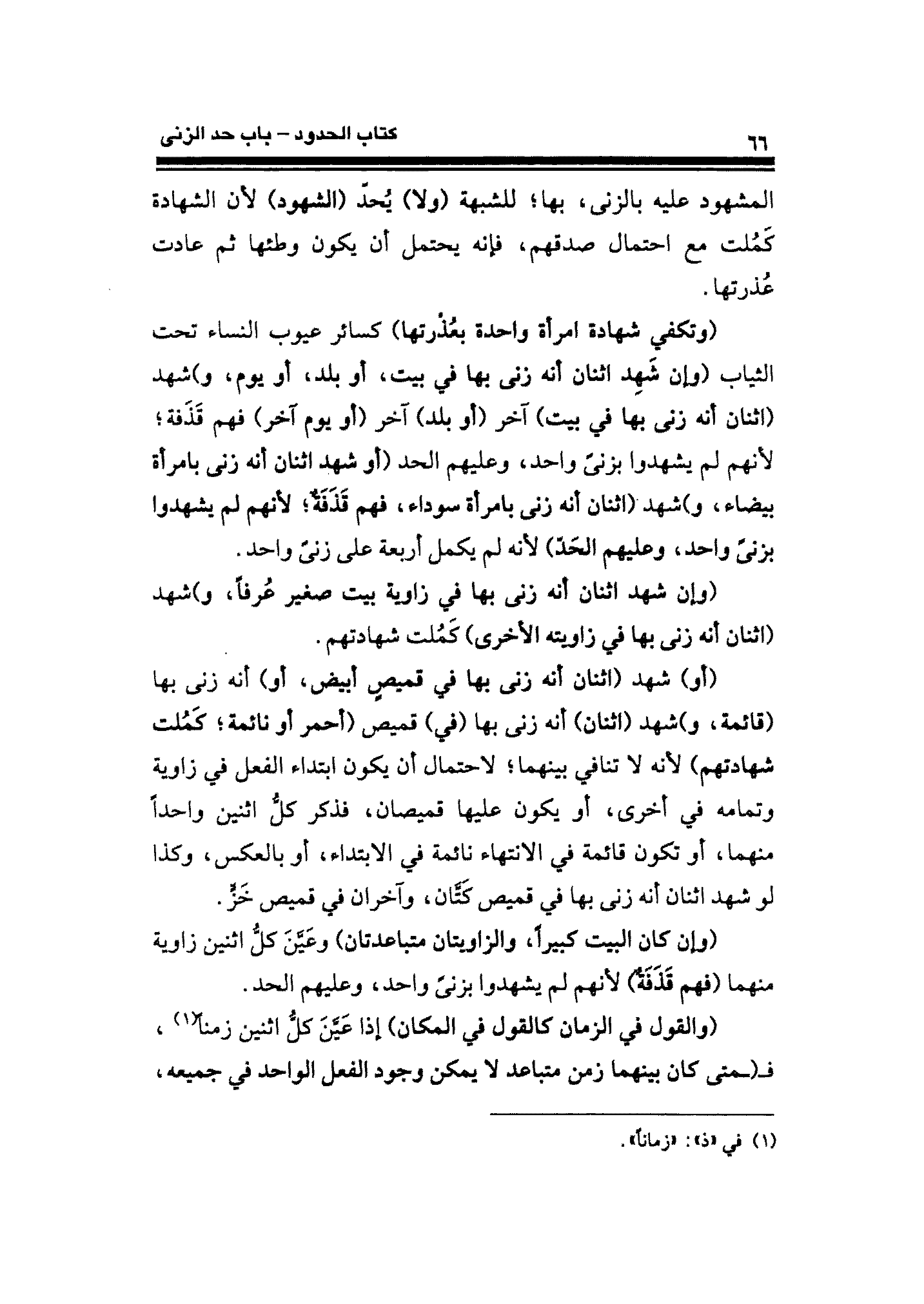 المشهود عليه بالزنى، بها؛ للشبهة (ولا) يُحدّ (الشهود) لأن الشهادة كَمُلت مع احتمال صدقهم، فإنه يحتمل أن يكون. وطئها ثم عادت عُذرتها.