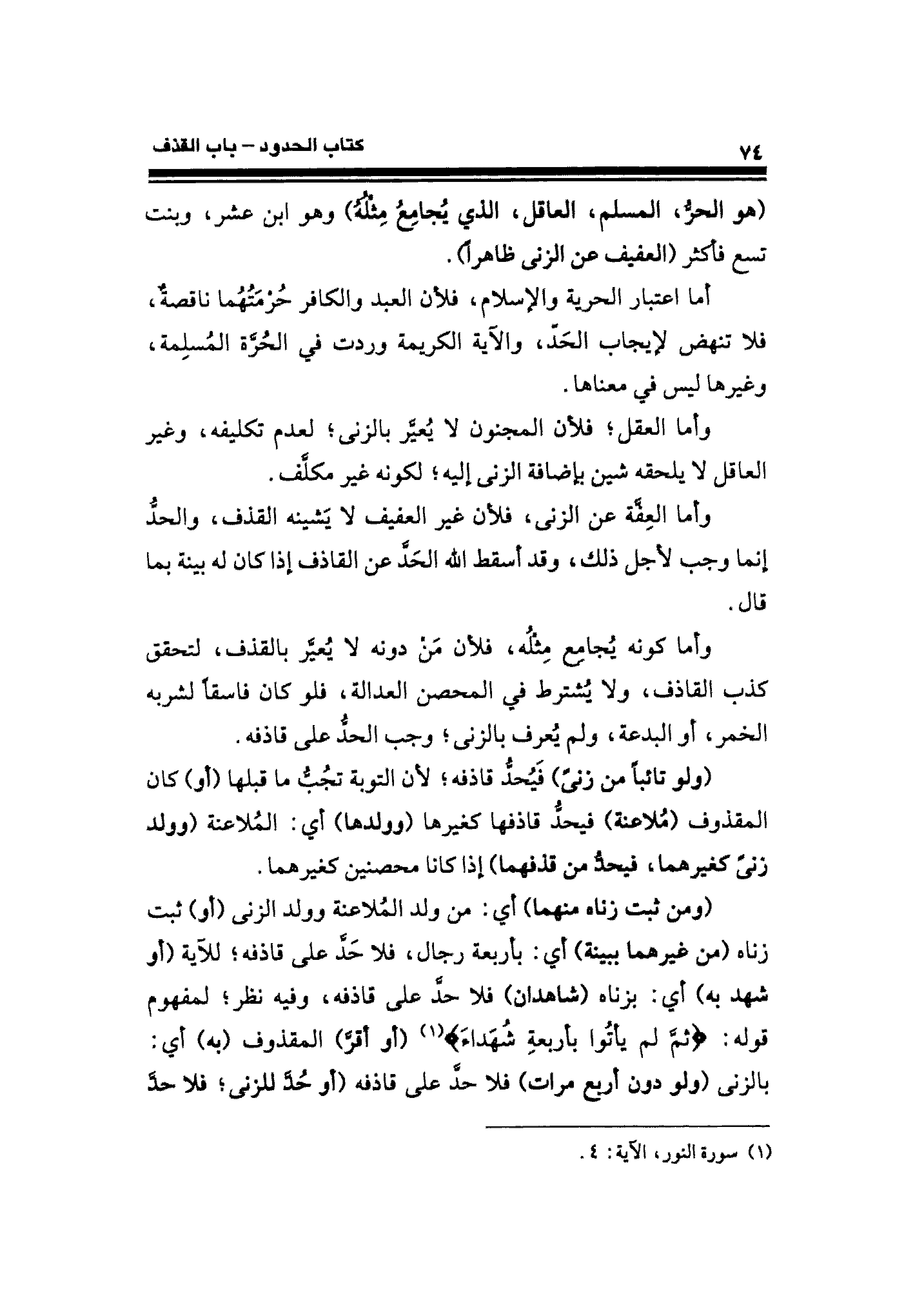 وأما العِفَّة عن الزنى، فلأن غير العفيف لا يَشينه القذف، والحدُّ إنما وجب لأجل ذلك، وقد أسقط الله الحَدَّ عن القاذف إذا كان له بينة بما قال.