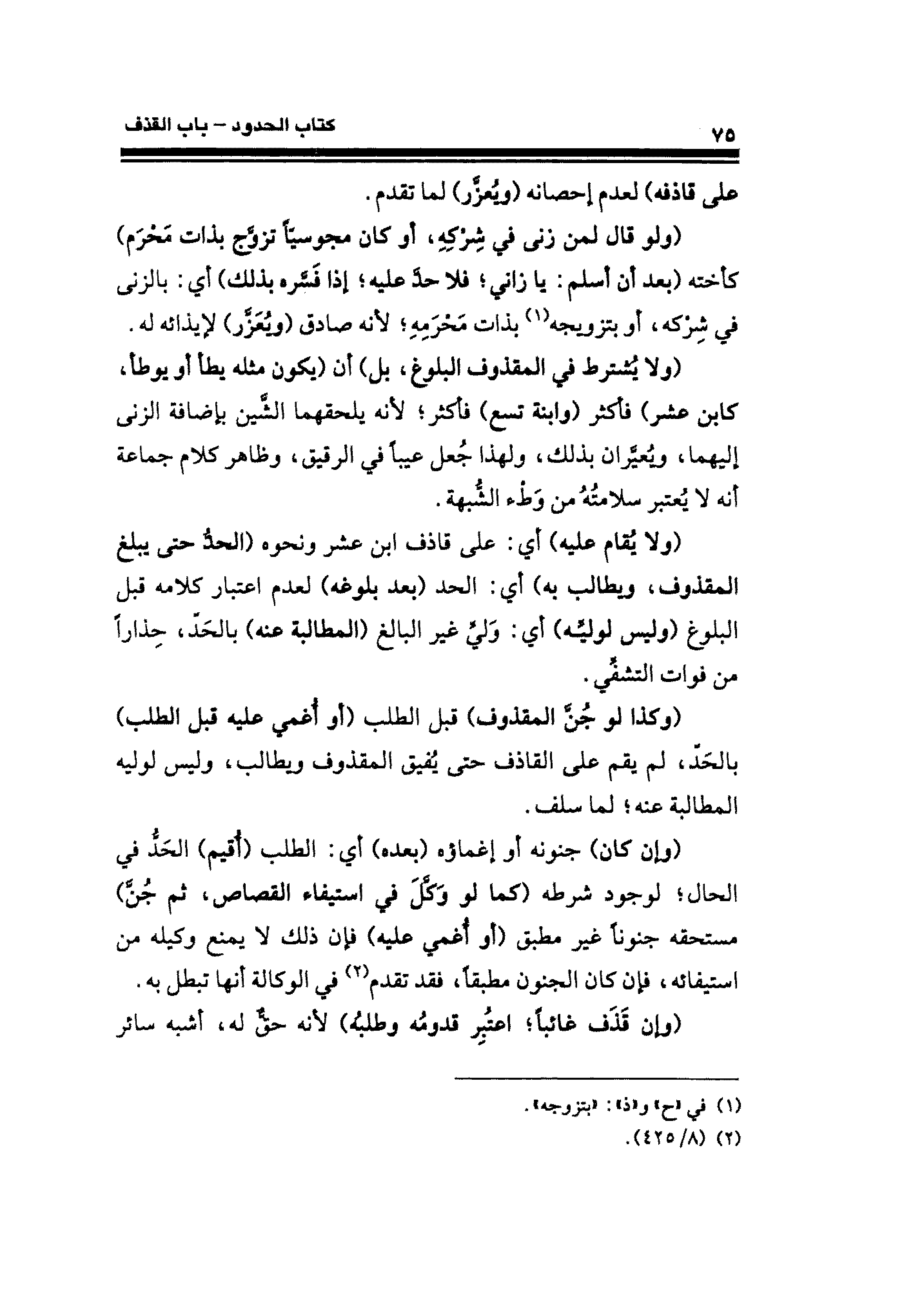 (ولو قال لمن زنى في شِرْكِهِ، أو كان مجوسيًّا تزوَّج بذات مَحْرَم) كأخته (بعد أن أسلم: يا زاني؛ فلا حدَّ عليه؛ إذا فَسَّره بذلك) أي: بالزنى في شِرْكه، أو بتزويجه (¬١) بذات مَحْرَمِهِ؛ لأنه صادق (ويُعَزَّر) لإيذائه له.