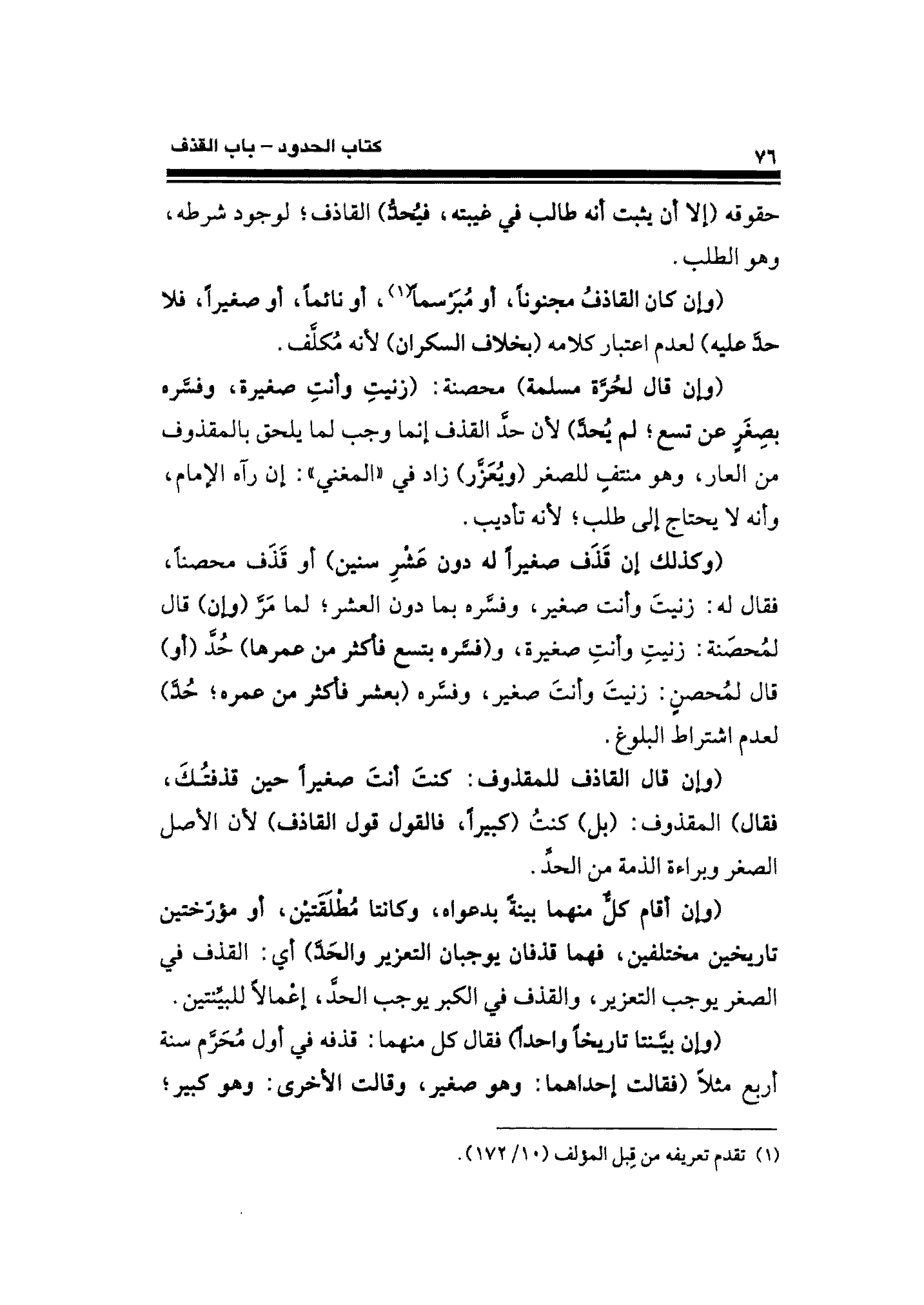 (وكذلك إن قَذَف صغيرًا له دون عَشْرِ سنين) أو قَذَف محصنًا، فقال له: زنيتَ وأنت صغير، وفسَّره بما دون العشر؛ لما مَرَّ (وإن) قال لمُحصَنة: زنيتِ وأنتِ صغيرة، و (فسَّره بتسع فأكثر من عمرها) حُدَّ (أو) قال لمُحصنٍ: زنيتَ وأنتَ صغير، وفسَّره (بعشر فأكثر من عمره؛ حُدَّ) لعدم اشتراط البلوغ.