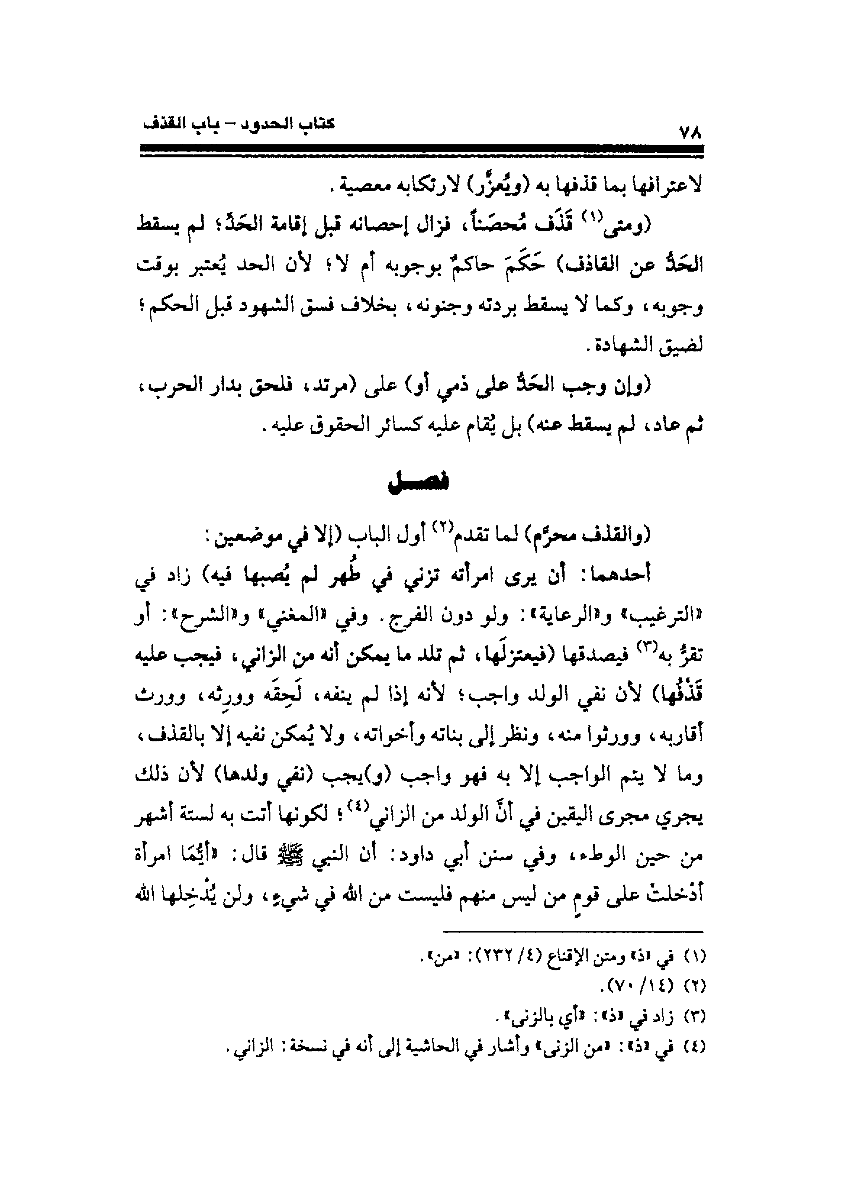 (والقذف محرَّم) لما تقدم (¬٢) أول الباب (إلا في موضعين: أحدهما: أن يرى امرأته تزني في طُهر لم يُصبها فيه) زاد في "الترغيب" و"الرعاية": ولو دون الفرج. وفي "المغني" و"الشرح": أو تقرُّ به (¬٣) فيصدقها (فيعتزلَها، ثم تلد ما يمكن أنه من الزاني، فيجب عليه قَذْفُها) لأن نفي الولد واجب؛ لأنه إذا لم ينفه، لَحِقَه وورِثه، وورث أقاربه، وورثوا منه، ونظر إلى بناته وأخواته، ولا يُمكن نفيه إلا بالقذف، وما لا يتم الواجب إلا به فهو واجب (و) يجب (نفي ولدها) لأنّ ذلك يجري مجرى اليقين في أنَّ الولد من الزاني (¬٤)؛ لكونها أتت به لستة أشهر من حين الوطء، وفي سنن أبي داود: أن النبي - صلى الله عليه وسلم - قال: "أيُّمَا امرأة أذخلت على قومٍ من ليس منهم فليست من الله في شيءٍ، ولن يُدْخِلها الله