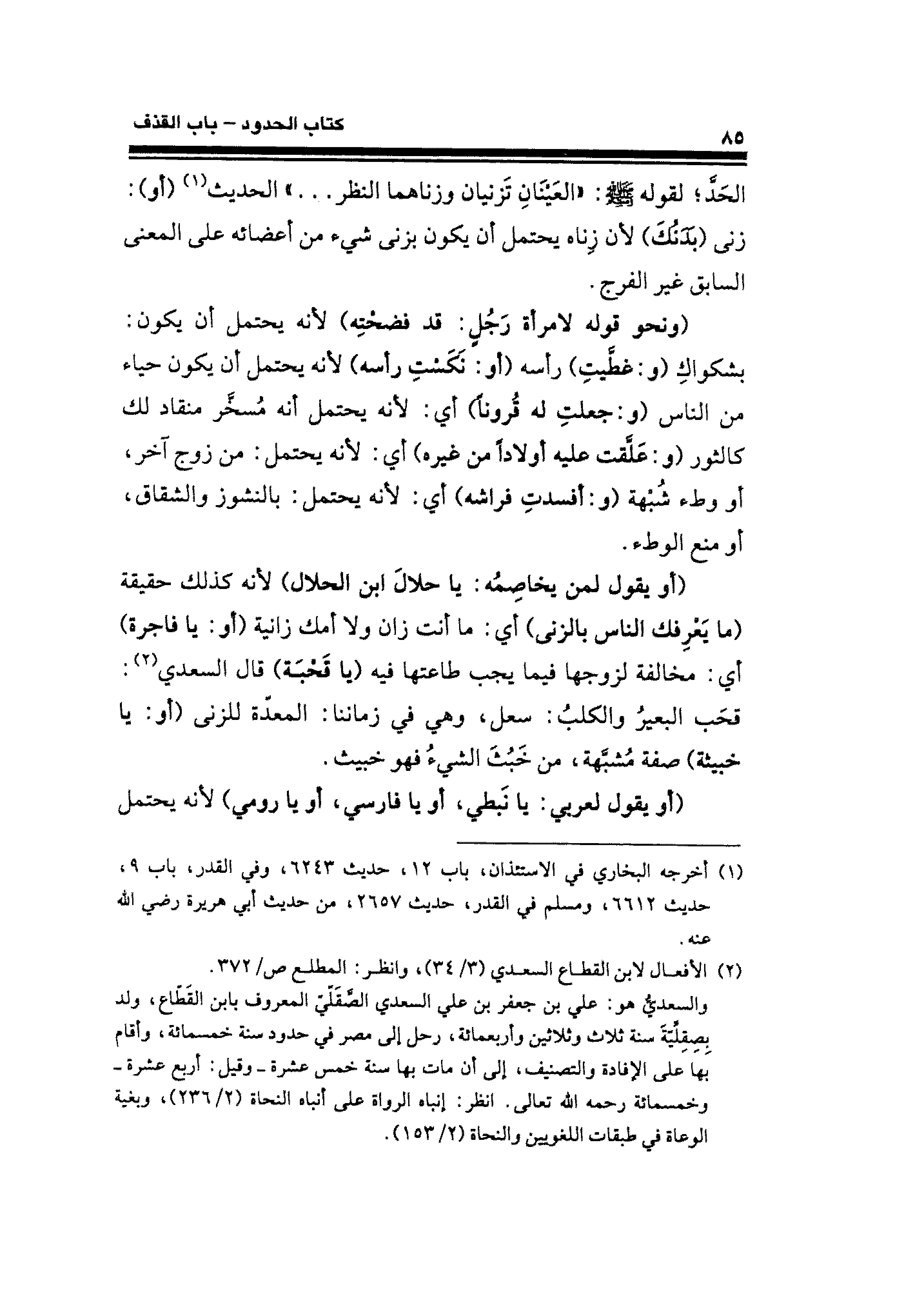 (أو يقول لمن يخاصِمُه: يا حلال ابن الحلال) لأنه كذلك حقيقة (ما يُعْرفك الناس بالزنى) أي: ما أنت زان ولا أمك زانية (أو: يافاجرة) أي: مخالفة لزوجها فيما يجب طاعتها فيه (يا قَحْبة) قال السعديّ (¬٢): قحَب البعير والكلبُ: سعل، وهي في زماننا: المعدّة للزنى (أو: يا خبيثة) صفة مُشبَّهة، من خَبُثَ الشيُ فهو خبيث.