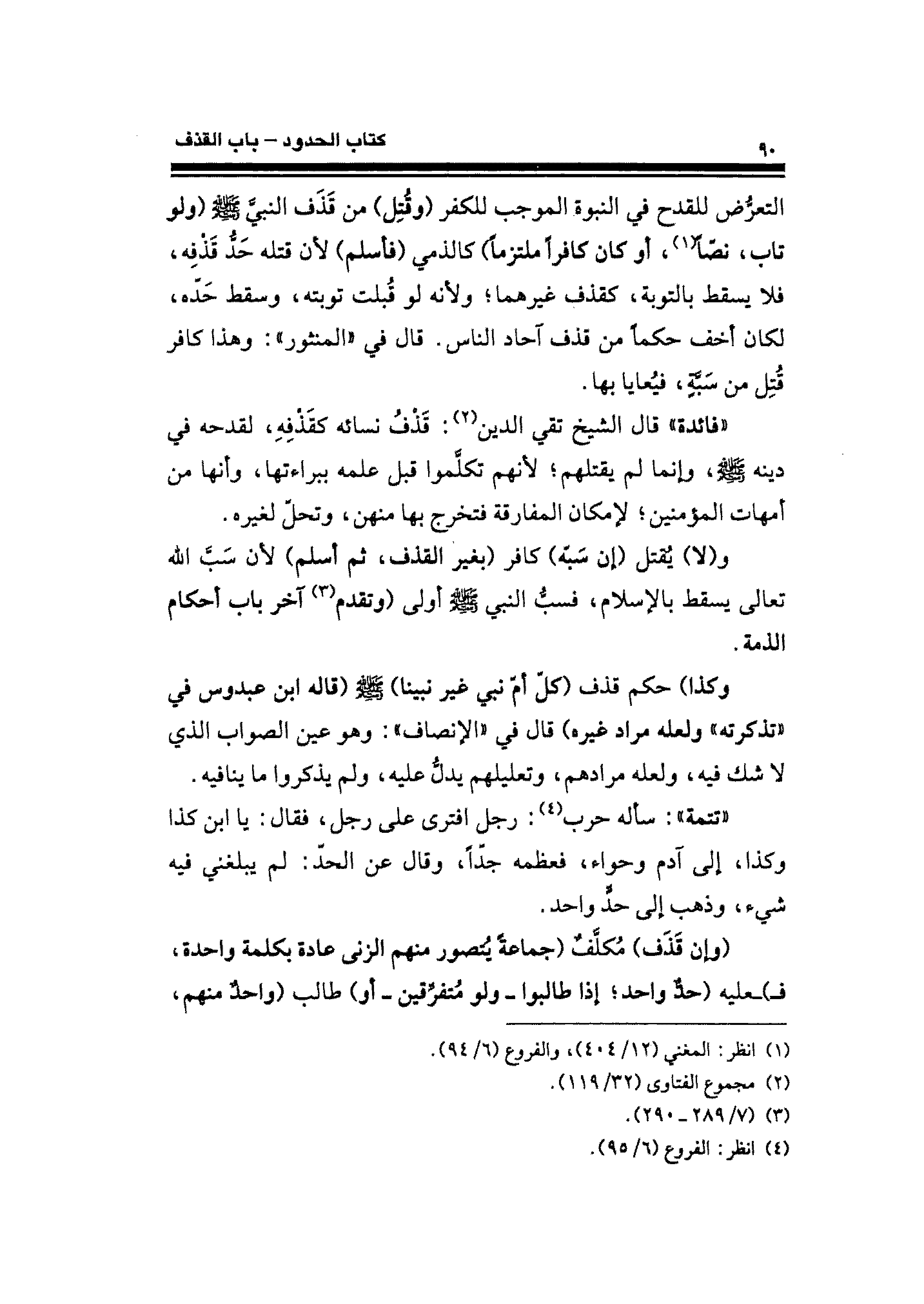 التعرُّض للقدح في النبوة الموجب للكفر (وقُتِل) من قَذَف النبيَّ - صلى الله عليه وسلم - (ولو تاب، نصًّا) (¬١)، أو كان كافرًا ملنزمًا) كالذمي (فأسلم) لأن قتله حَدُّ قَذْفِه، فلا يسقط بالتوبة، كقذف غيرهما؛ ولأنه لو قُبلت توبته، وسقط حَدّه، لكان أخف حكمًا من قذف آحاد الناس. قال في "المنثور": وهذا كافر قُتِل من سَبَّةٍ، فيُعايا بها.