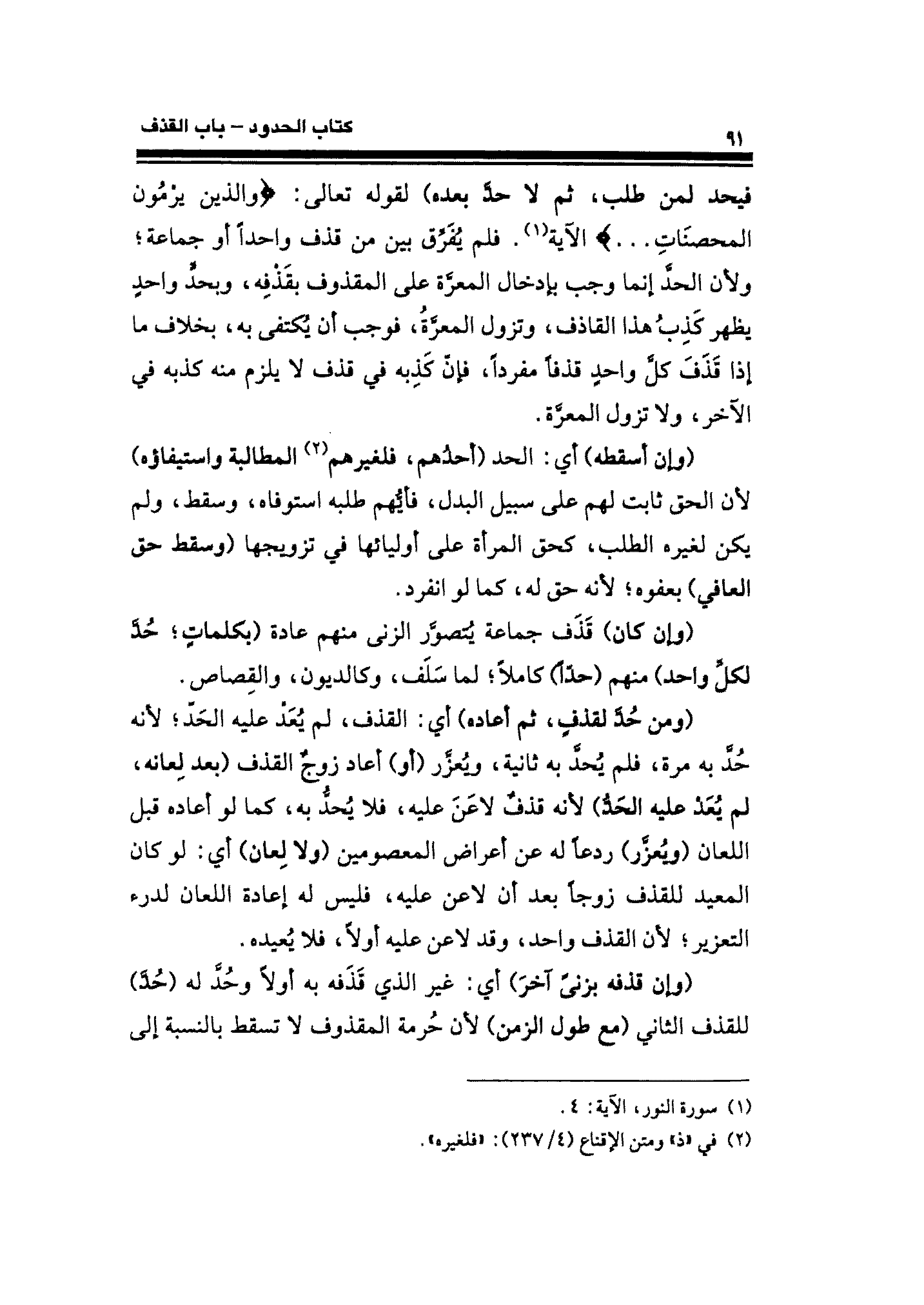 فيحد لمن طلب، ثم لا حدَّ بعده) لقوله تعالى: {وَالَّذِينَ يَرْمُونَ الْمُحْصَنَاتِ. . .} الآية (¬١). فلم يُفَرِّق بين من قذف واحدًا أو جماعة؛ ولأن الحدَّ إنما وجب بإدخال المعرَّة على المقذوف بقَذْفِه، وبحدٍّ واحدٍ يظهر كَذِبُ هذا القاذف، وتزول المعرَّةُ، فوجب أن يكتفى به، بخلاف ما إذا قَذَف كلٌّ واحدٍ قذفًا مفردًا، فإنّ كَذِبه في قذف لا يلزم منه كذبه في الآخر، ولا تزول المعرَّة.