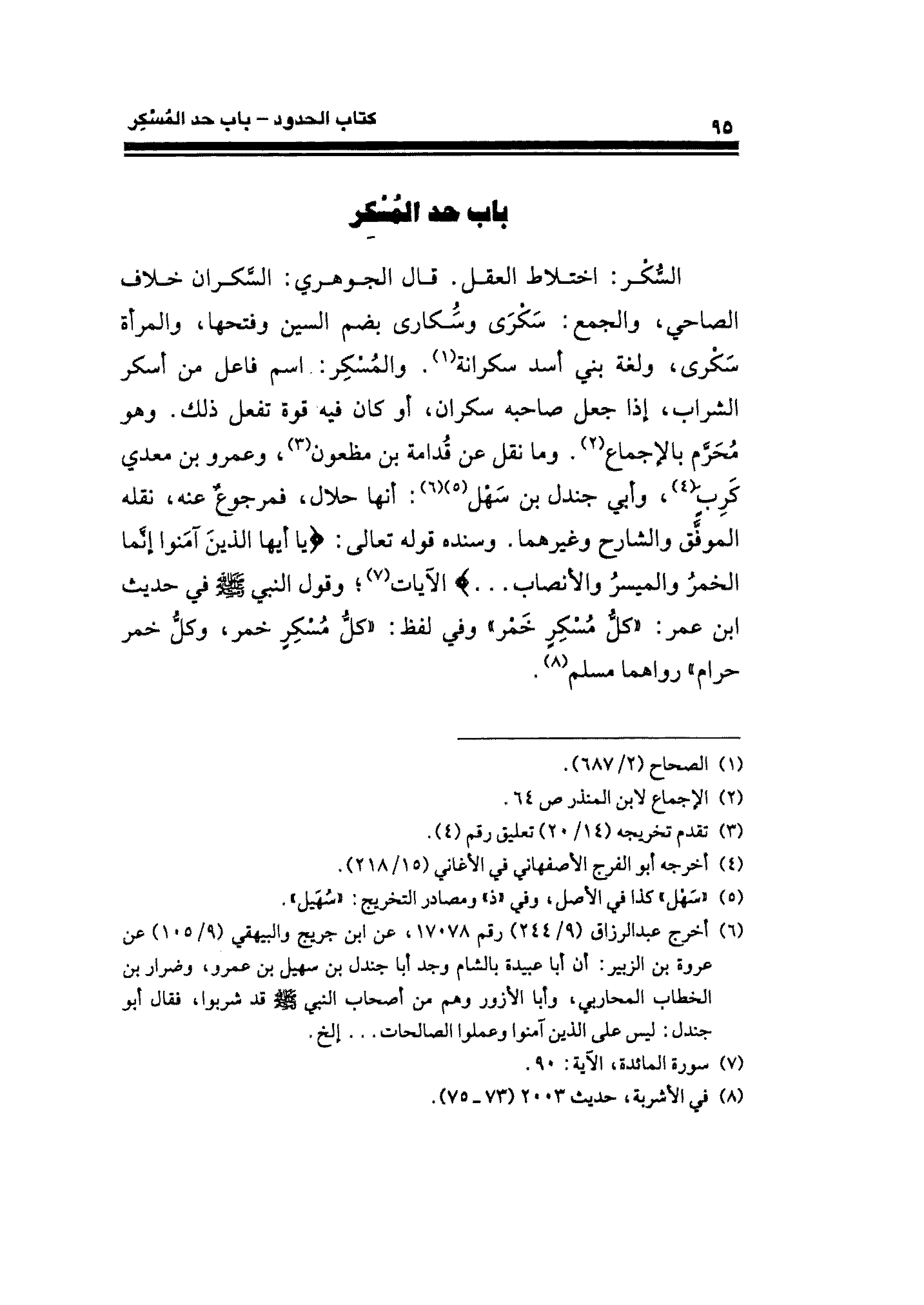 السُّكْر: اختلاط العقل. قال الجوهري: السَّكران خلاف الصاحي، والجمع: سَكْرَى وسُّكارى بضم السين وفتحها، والمرأة سَكْرى، ولغة بنى أسد سكرانة (¬١). والمُسْكِر: اسم فاعل من أسكر الشراب، إذا جعل صاحبه سكران، أو كان فيه قوة تفعل ذلك. وهو مُحَرَّم بالإجماع (¬٢). وما نقل عن قُدامة بن مظعون (¬٣)، وعمرو بن معدي كَرِبَ (¬٤)، وأبي جندل بن سَهْل (¬٥) (¬٦): أنها حلال، فمرجوعٌ عنه، نقله الموفَّق والشارح وغيرهما. وسنده قوله تعالى: {يَا أَيُّهَا الَّذِينَ آمَنُوا إِنَّمَا الْخَمْرُ وَالْمَيسِرُ وَالْأَنْصَابُ. . .} الآيات (¬٧)؛ وقول النبي - صلى الله عليه وسلم - في حديث ابن عمر: "كلُّ مُسْكِرٍ خَمْر" وفي لفظ: "كلُّ مُسْكِرٍ خمر، وكلُّ خمر حرام" رواهما مسلم (¬٨).
